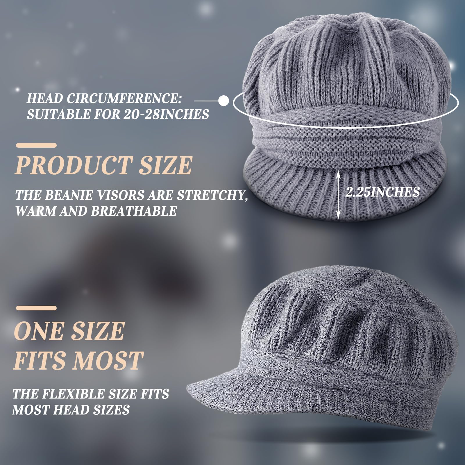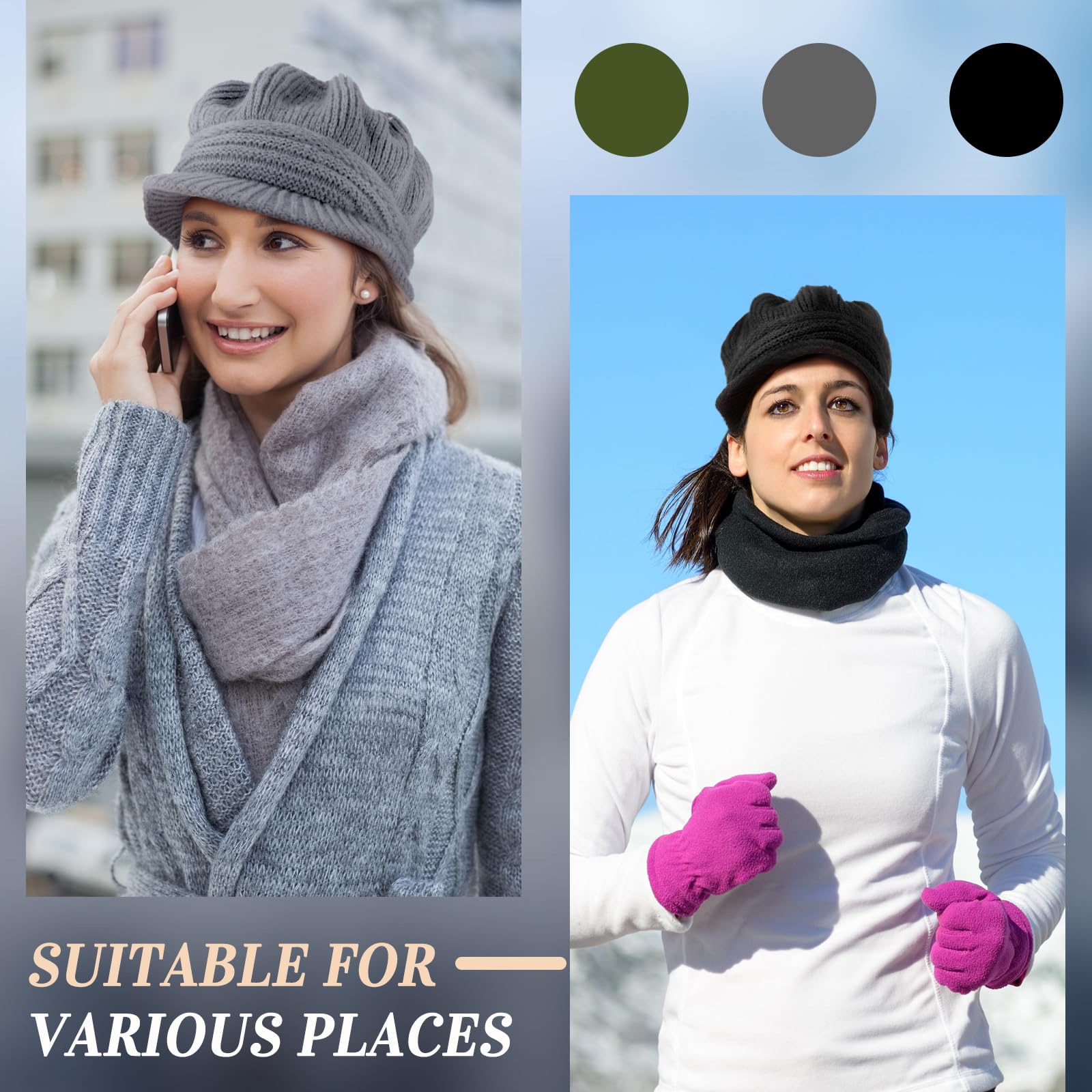 3-piece women's winter warm hat, casual brimless hat with brim and earflap, knitted newsboy hat, women's ski snow cap