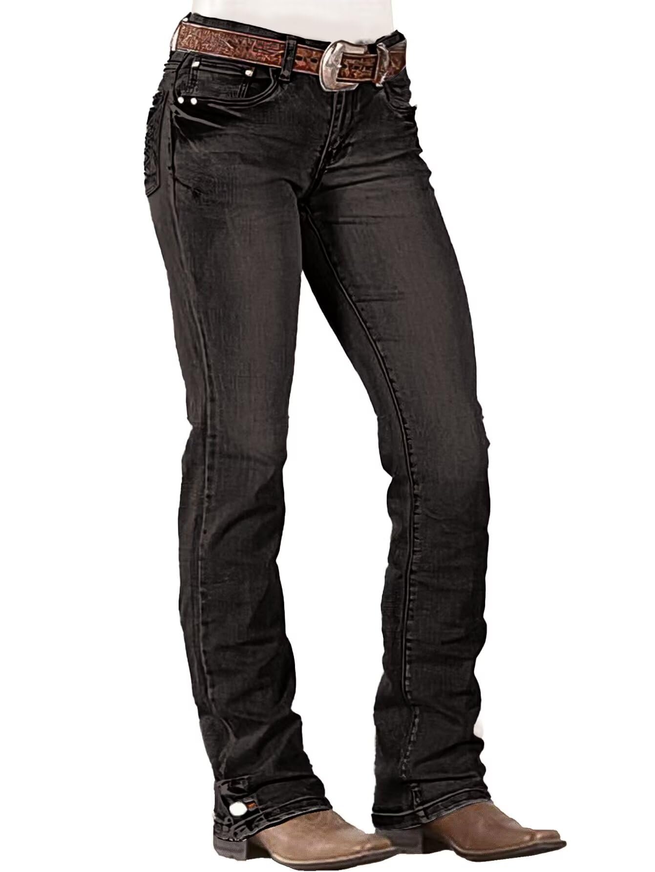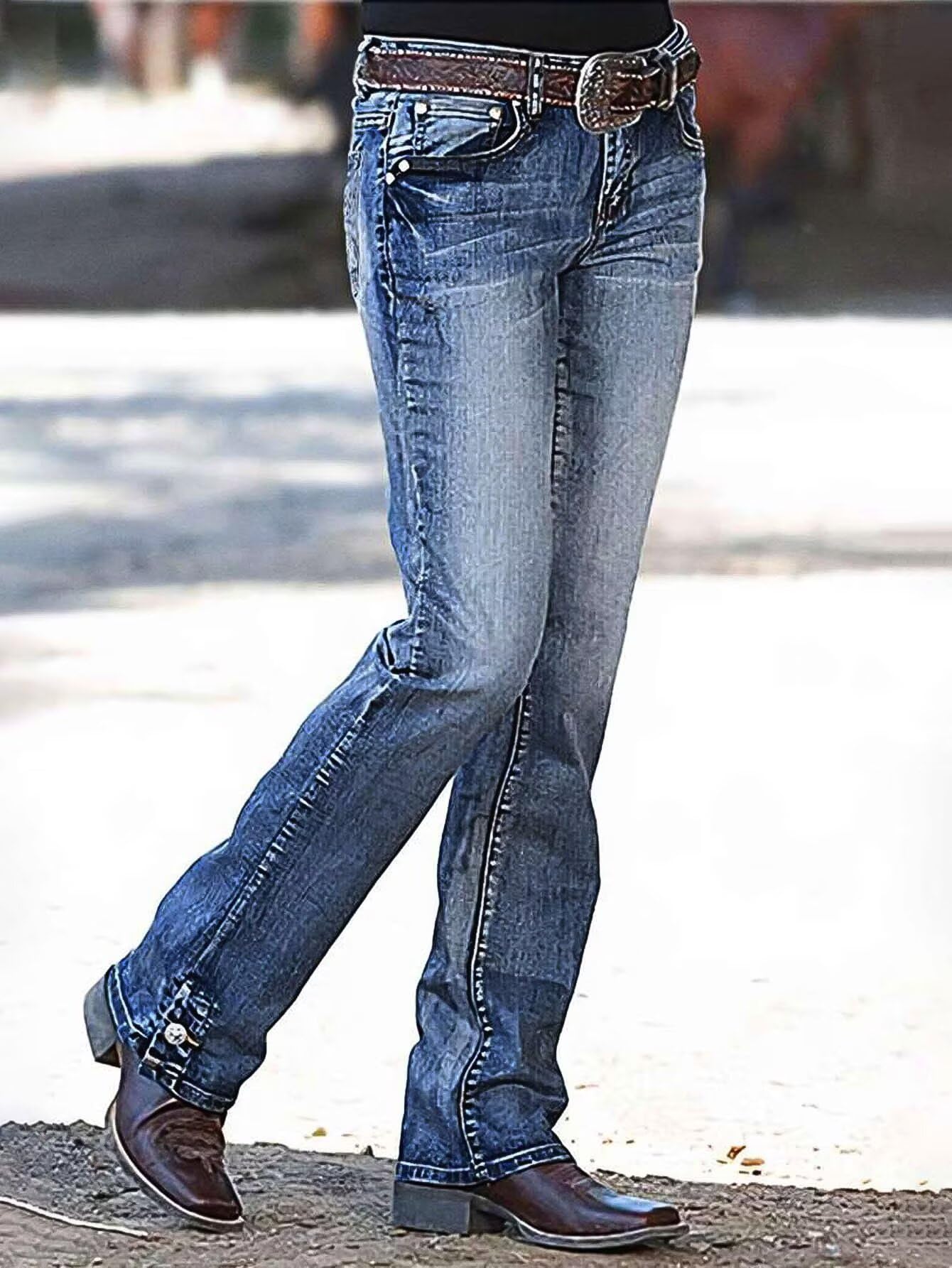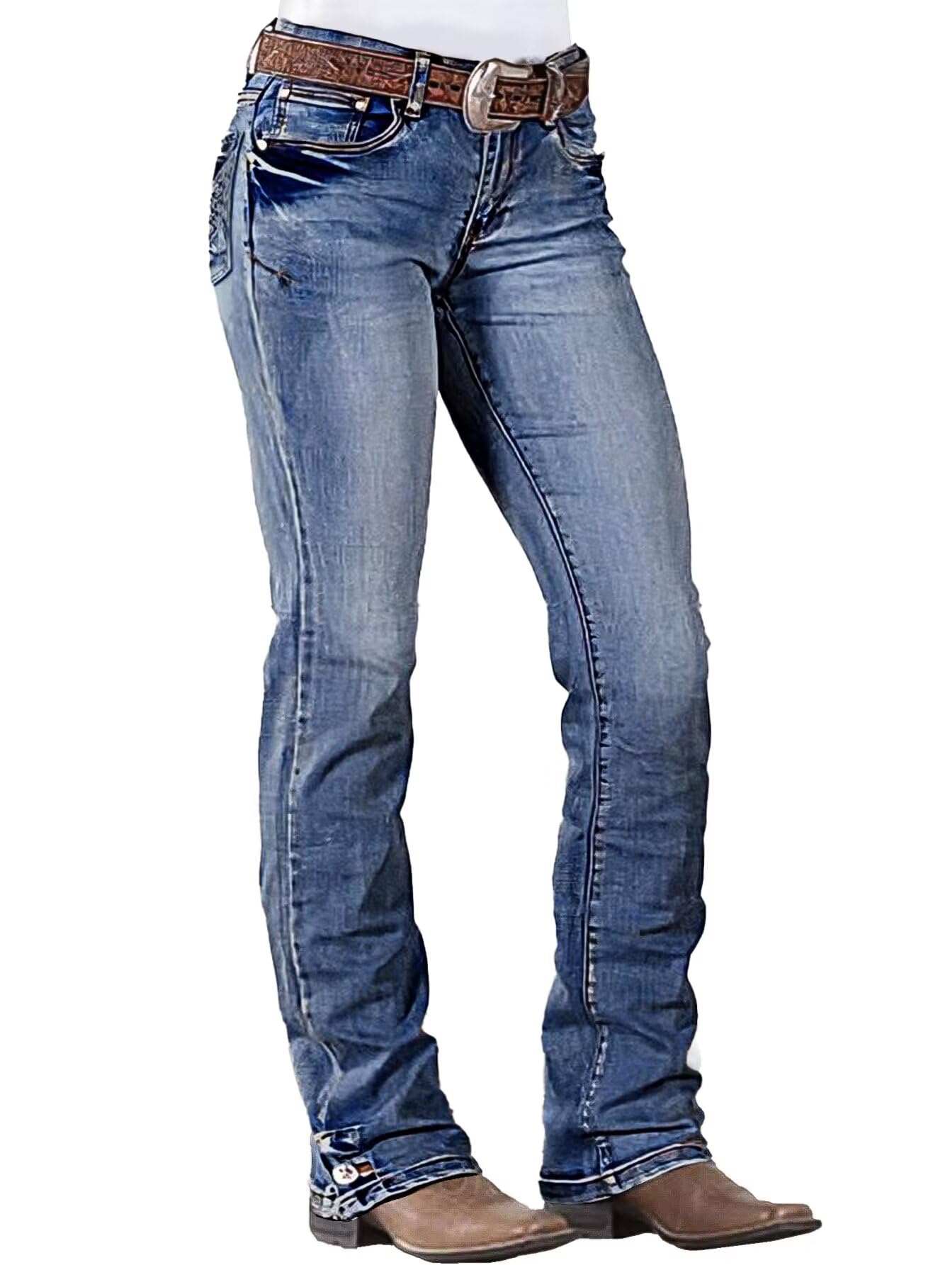بنطلون جينز للنساء ذو قصة مستقيمة بخصر متوسط وبنطلون جينز عصري من قماش الدنيم