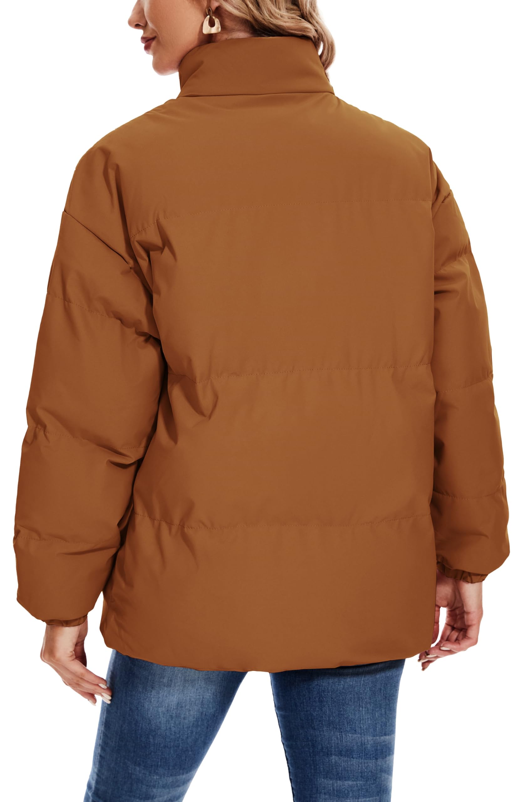 سترة نسائية شتوية بأكمام طويلة وسحاب منتفخ وجيوب ومعاطف قصيرة وفضفاضة-لون القهوة