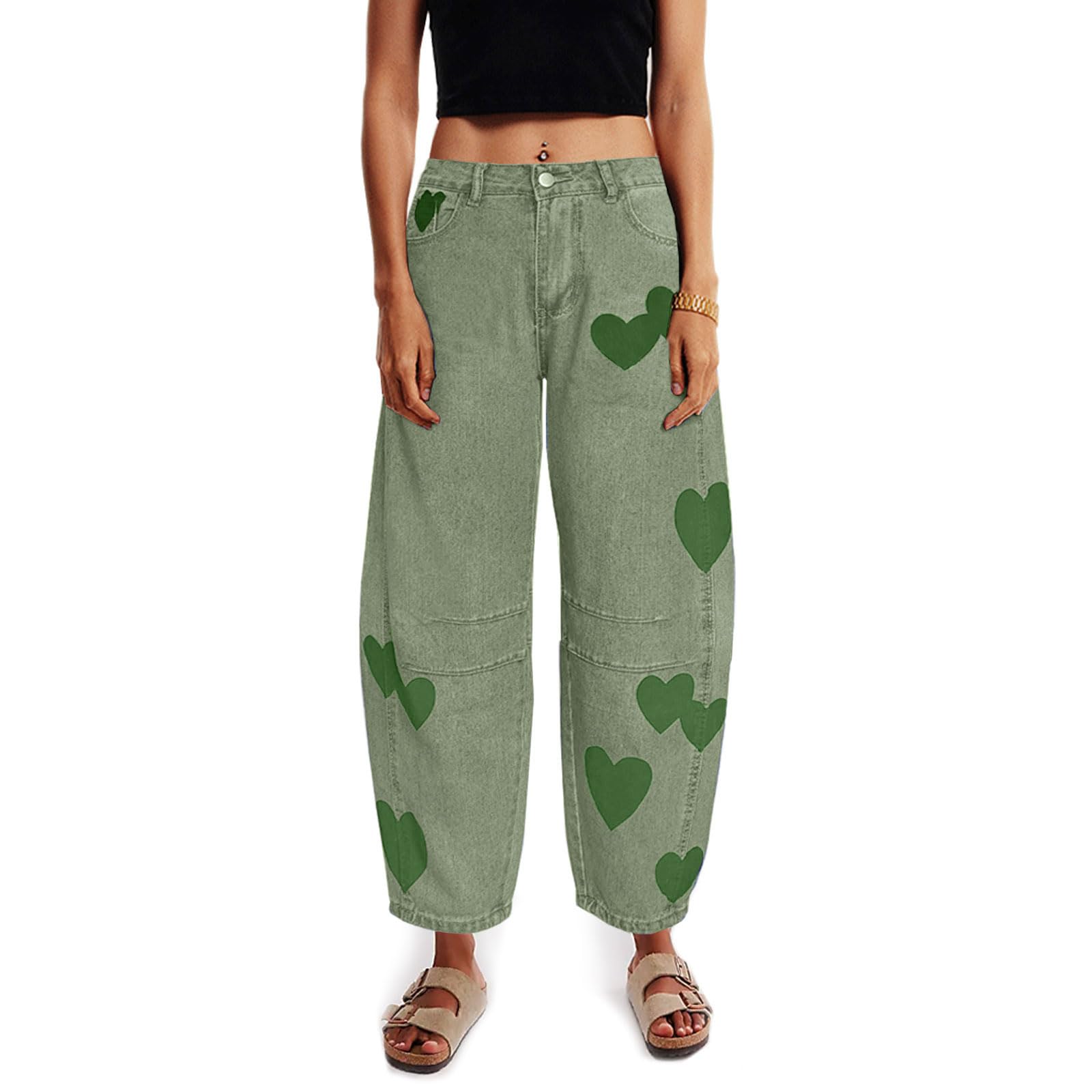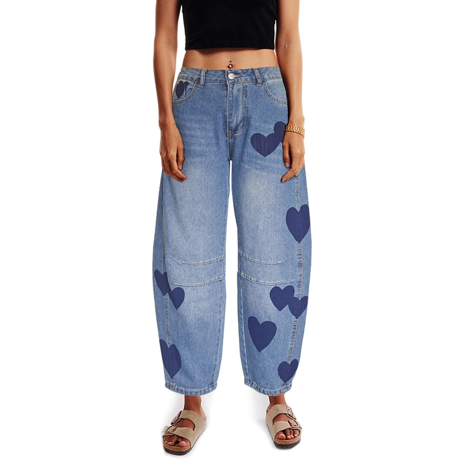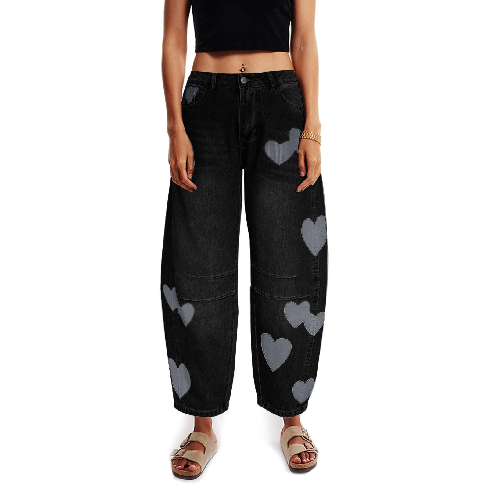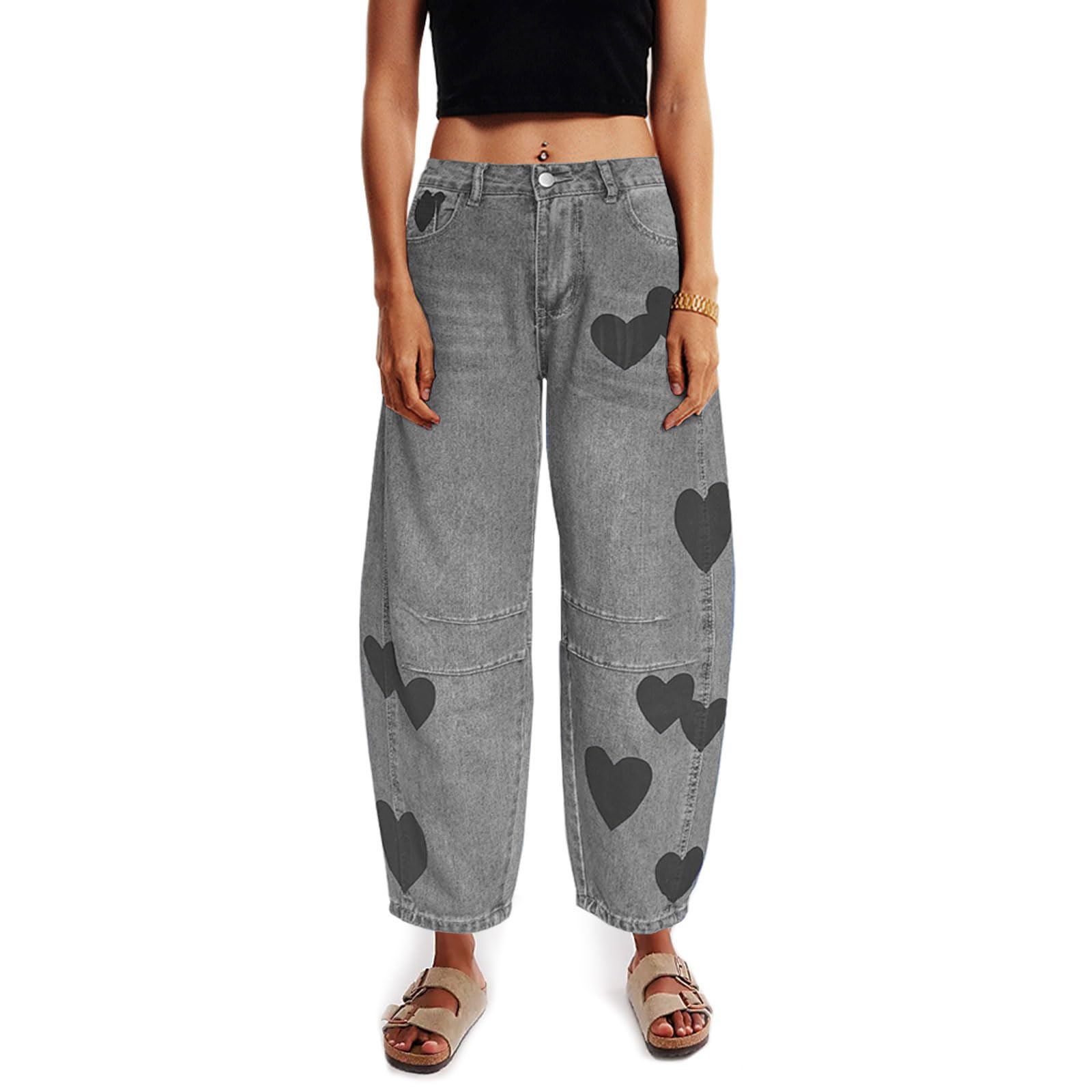 Barrel Jeans for Women Mid Rise Heart Printed Denim Ankle Pants Vintage Baggy Boyfriend Jeans