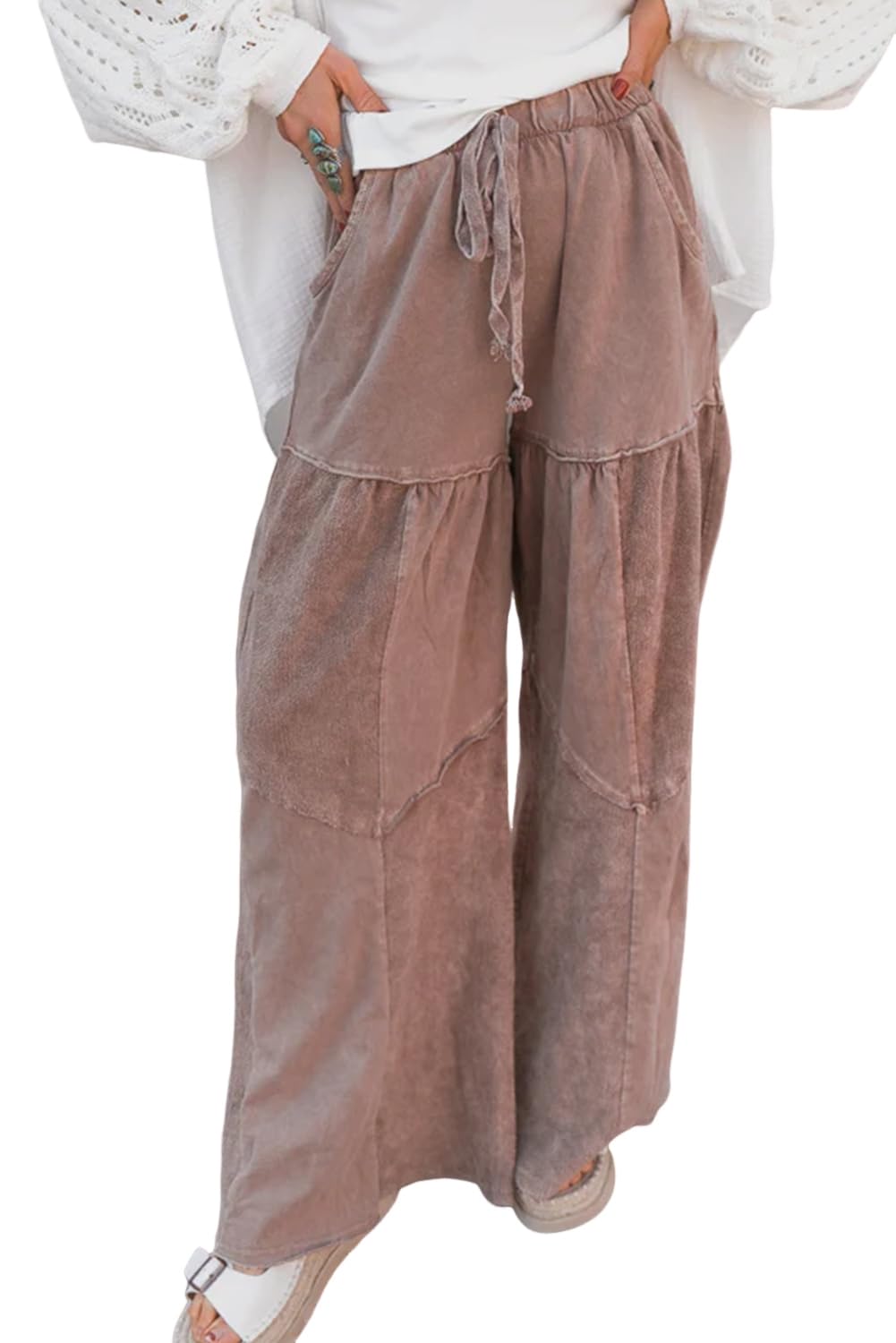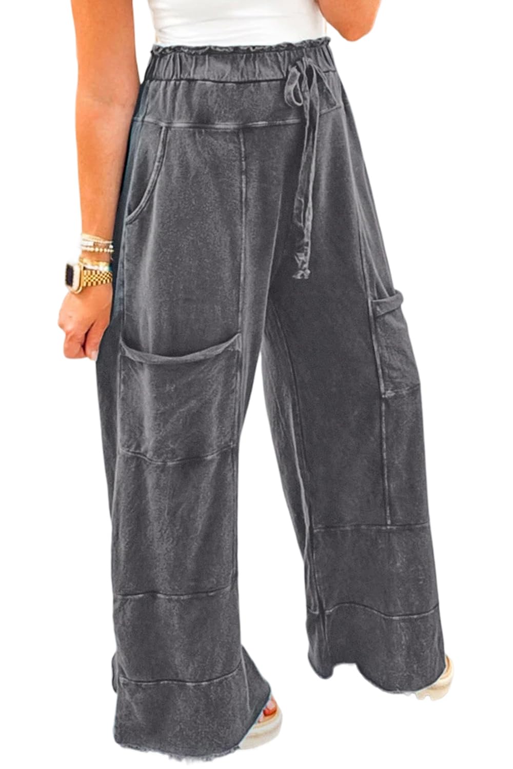 Casual Pants for Women Mineral Wash Lace-up Elastic High Waist Raw Hem Patched Pocket Solid Daily Trousers