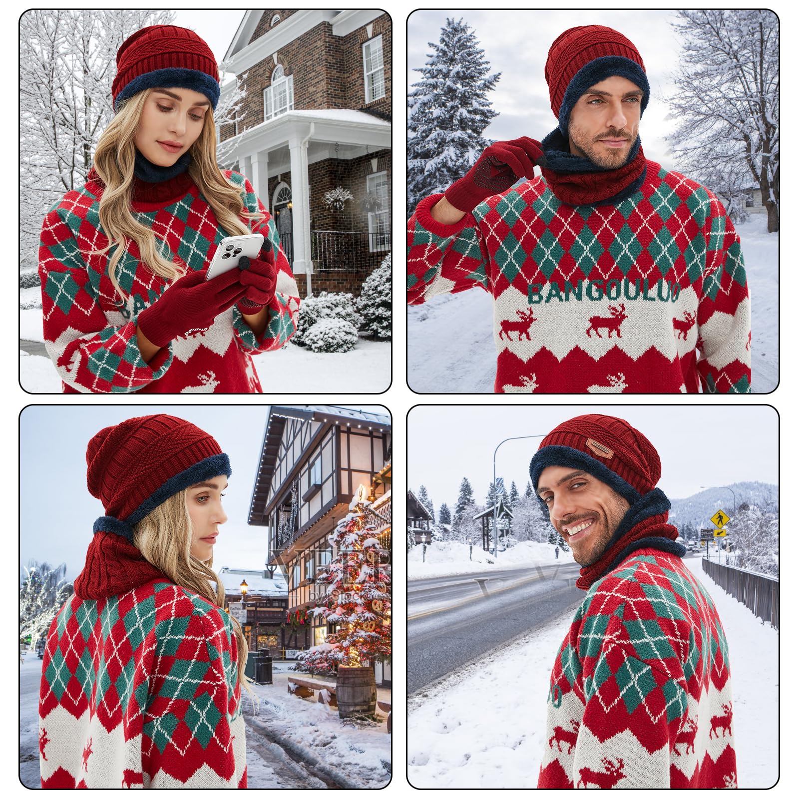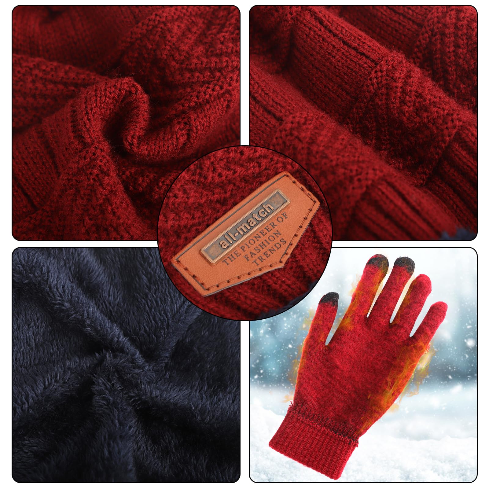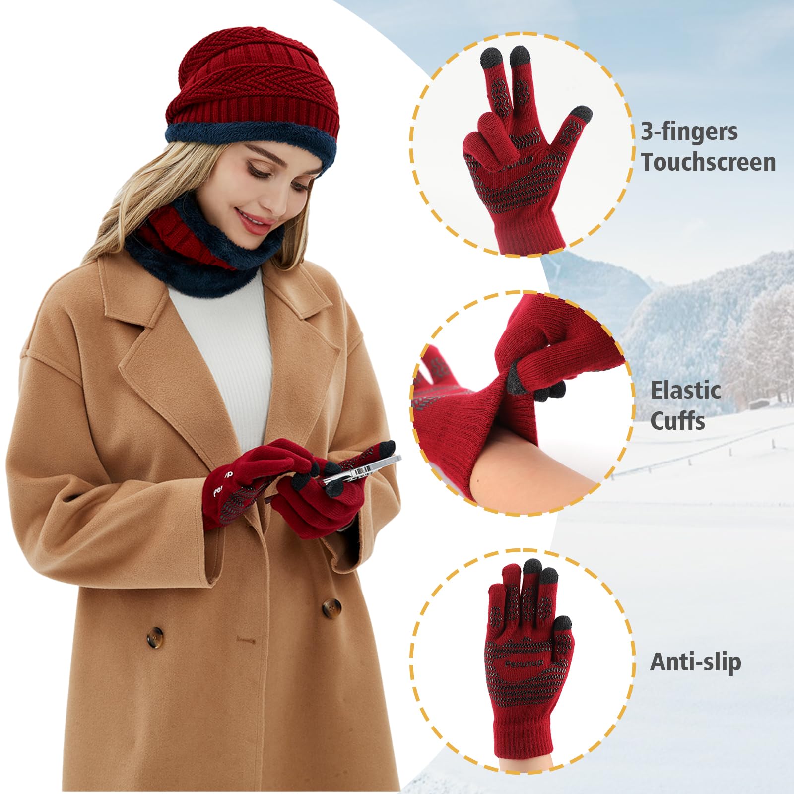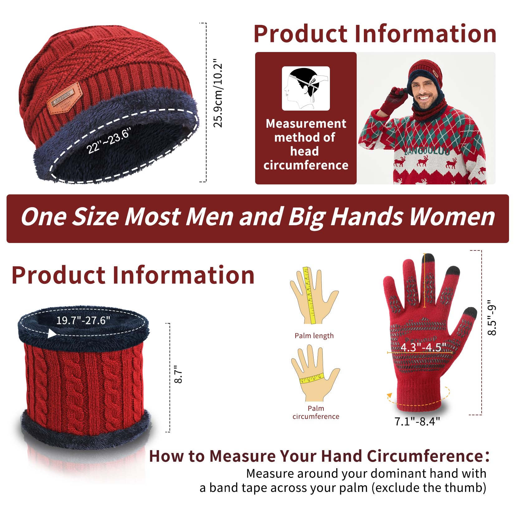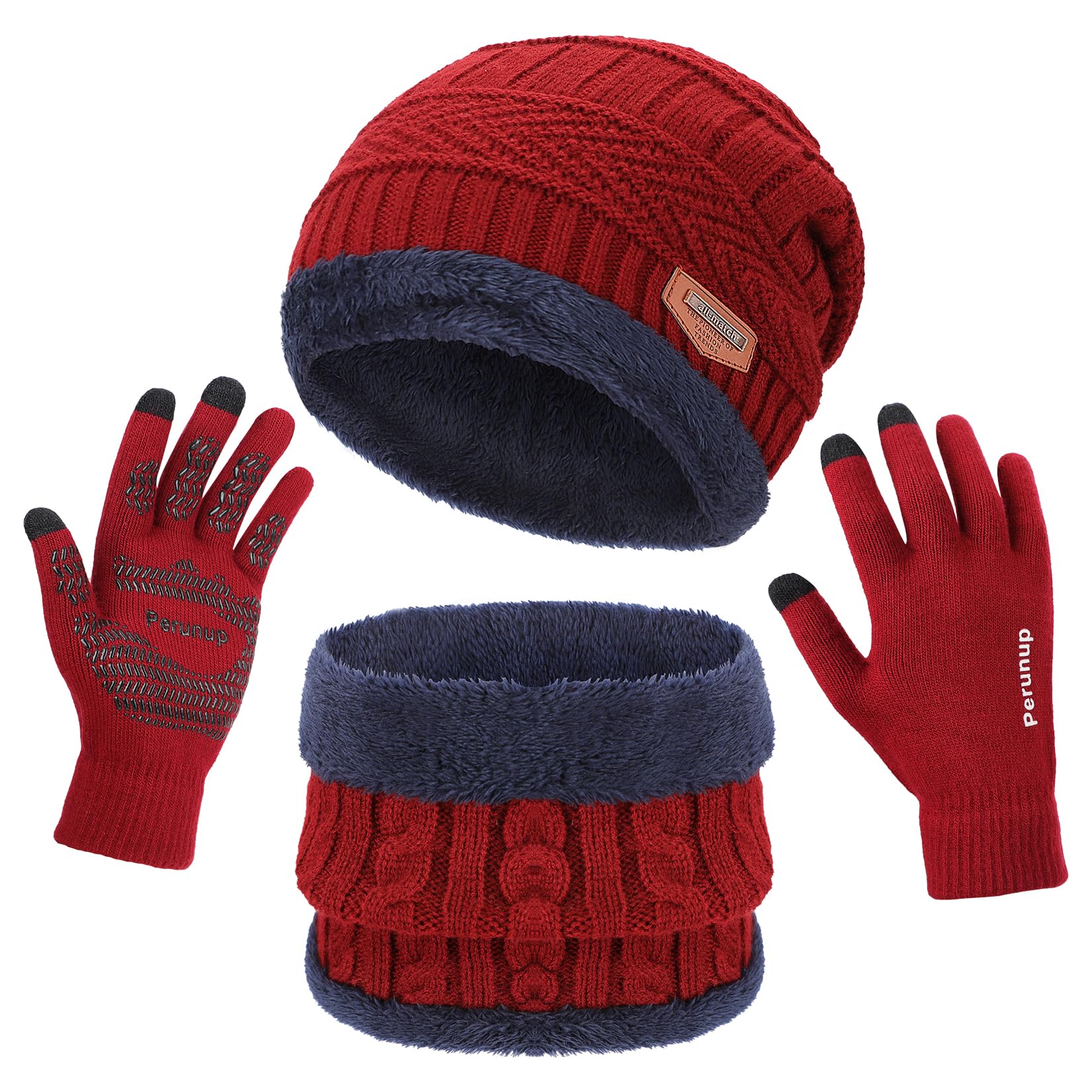 Conjunto de gorro de punto de invierno con bufanda calentadora de cuello y guantes para pantalla táctil - 3-lana de piezas-gorro de calavera forrado adecuado para hombres y mujeres