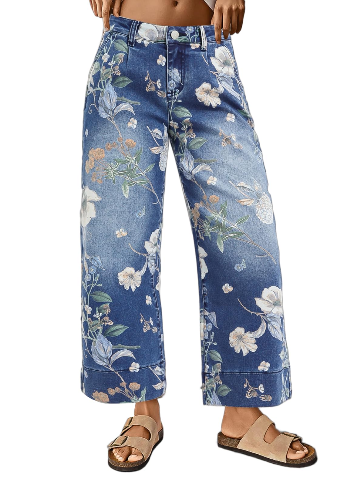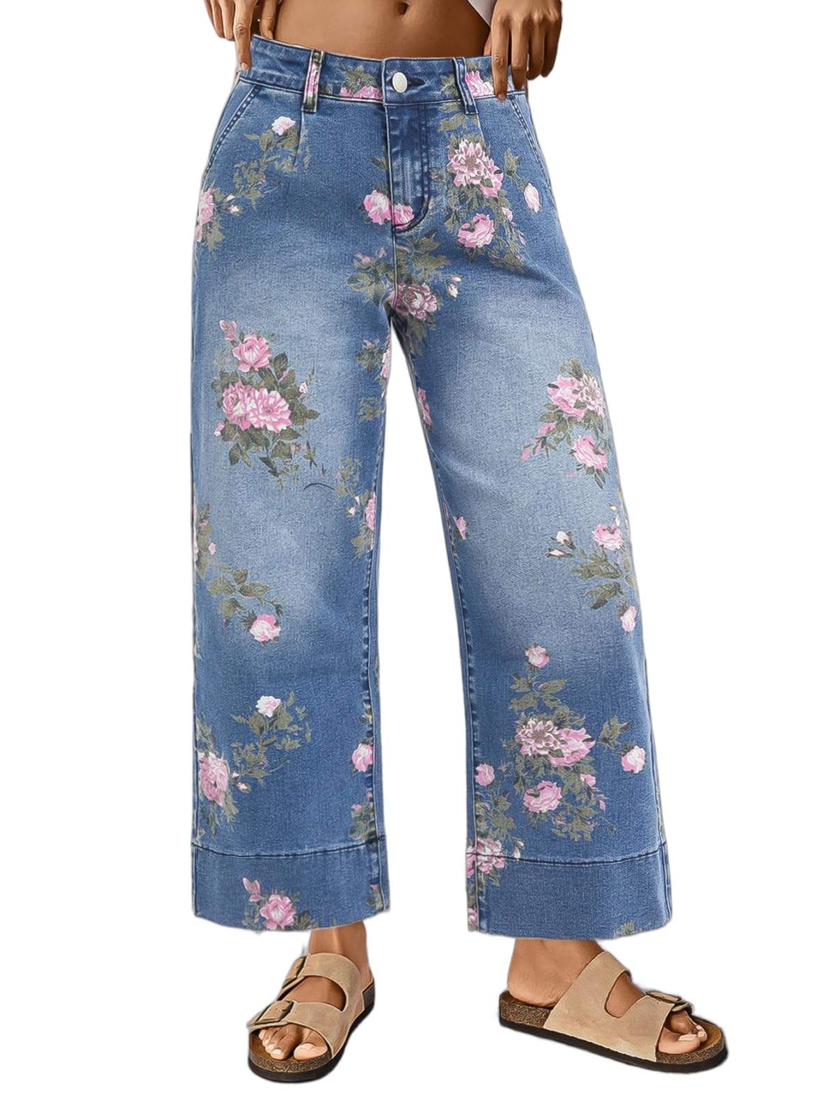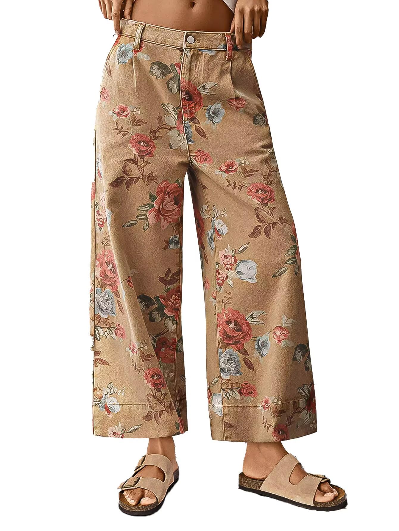 Floral Print Wide Leg Cropped Pants for Women Trendy Mid Rise Boho Ankle Cute Jeans
