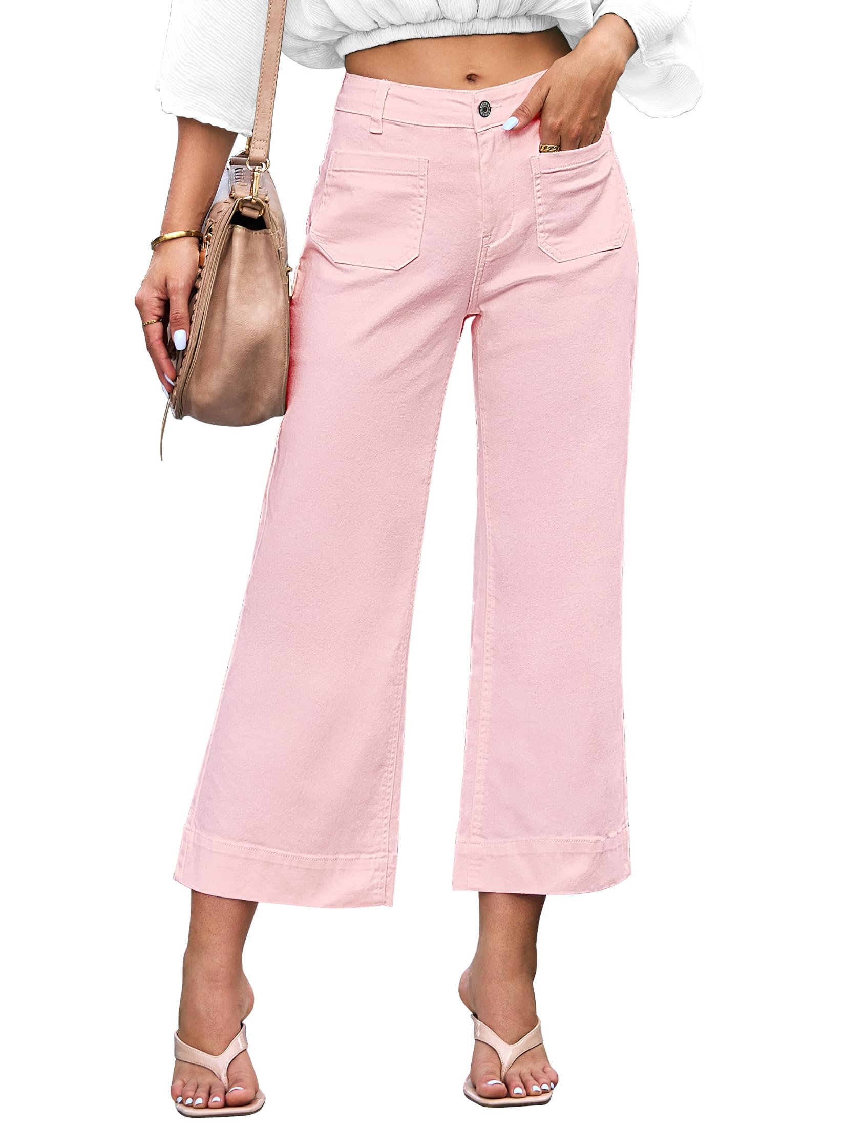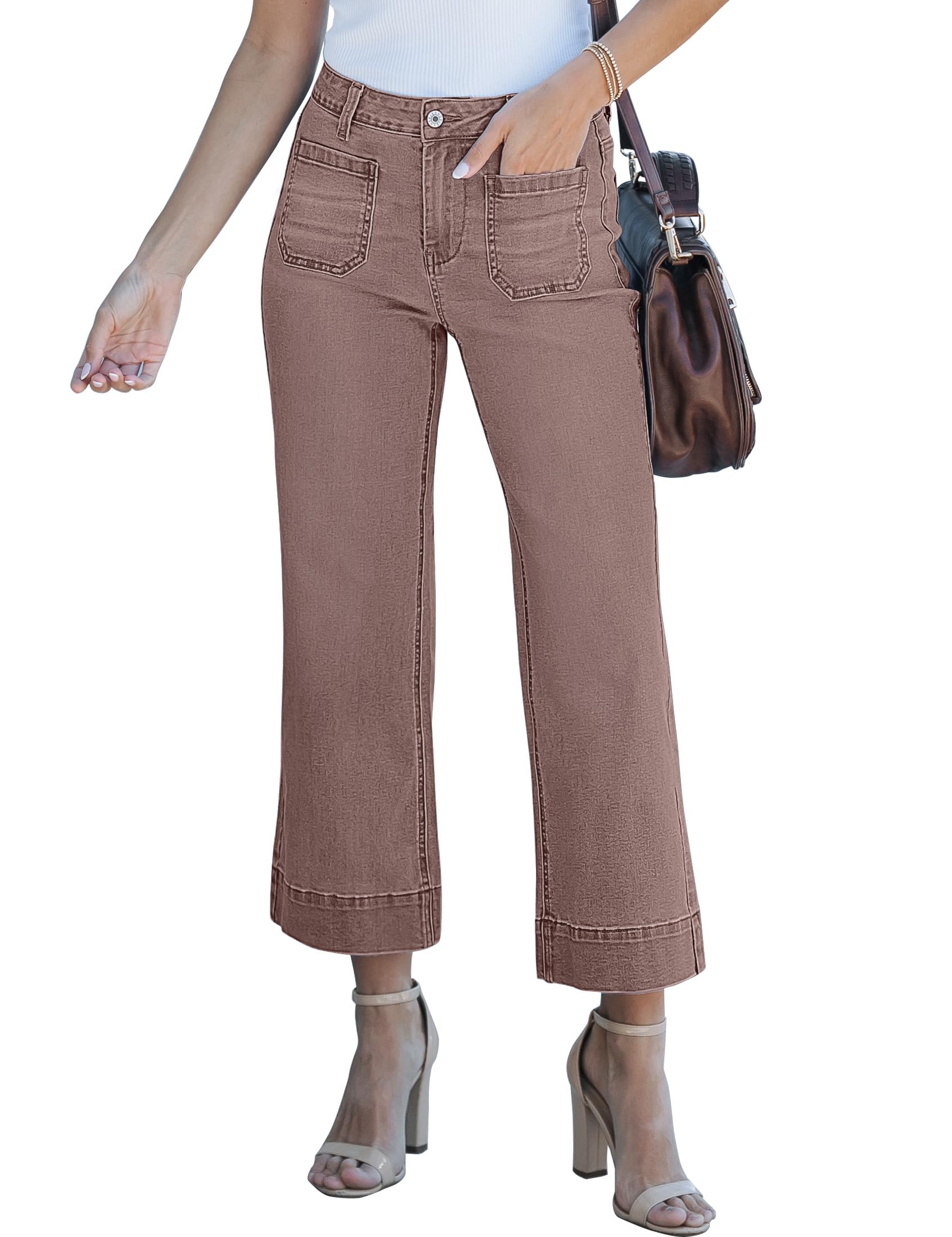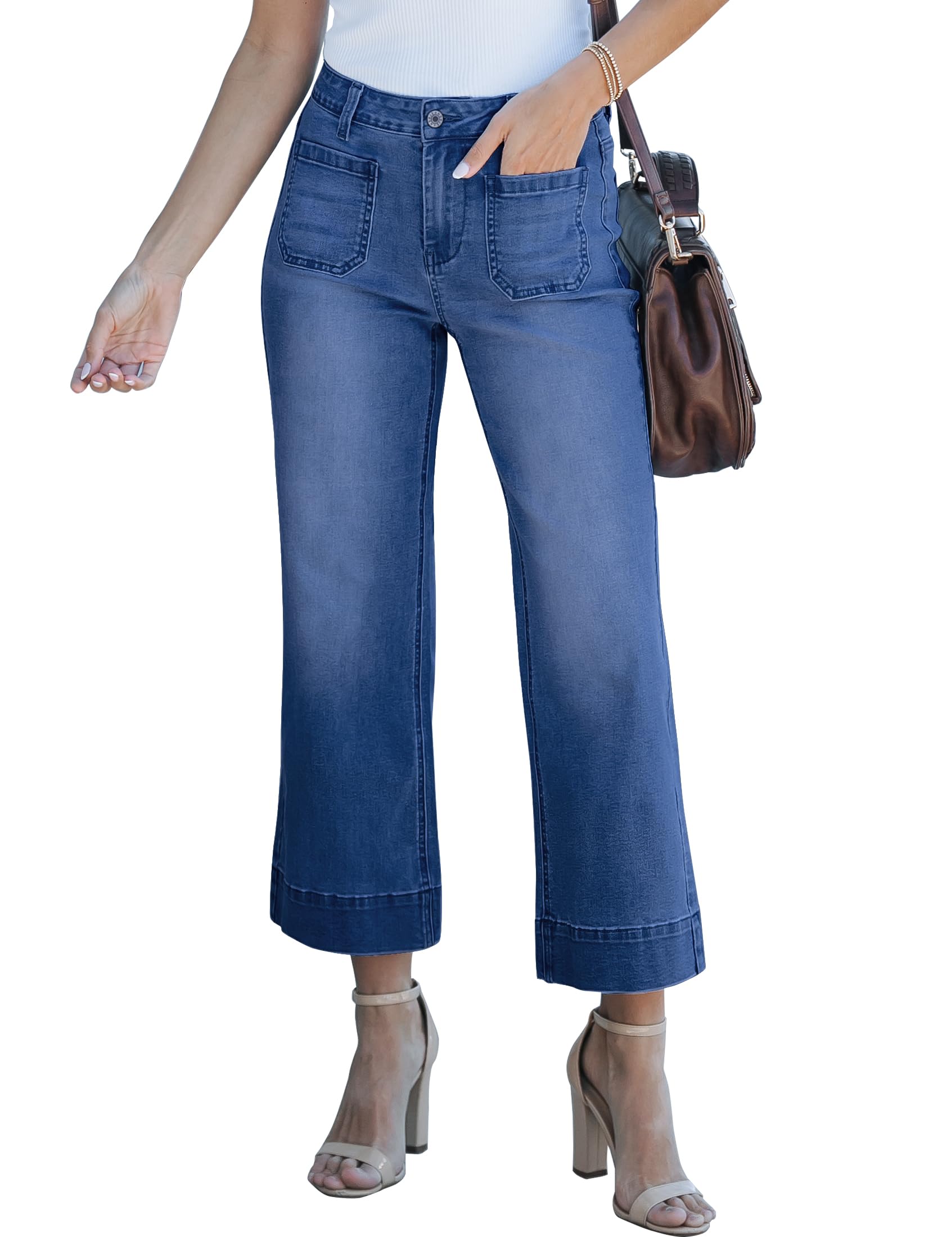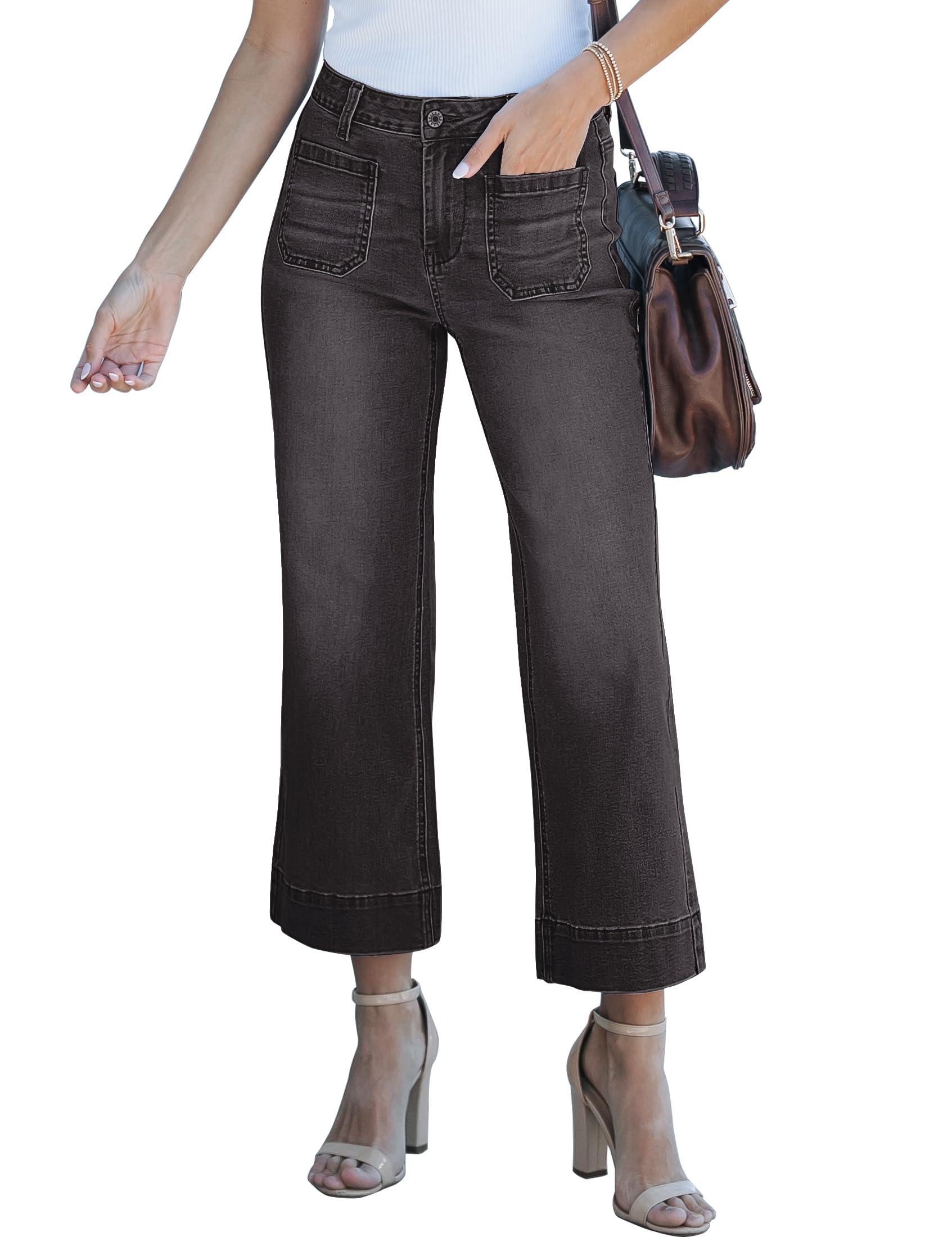 Jeans a gamba larga da donna Jeans svasati alla moda a vita alta Pantaloni in denim corti elasticizzati larghi con tasche applicate