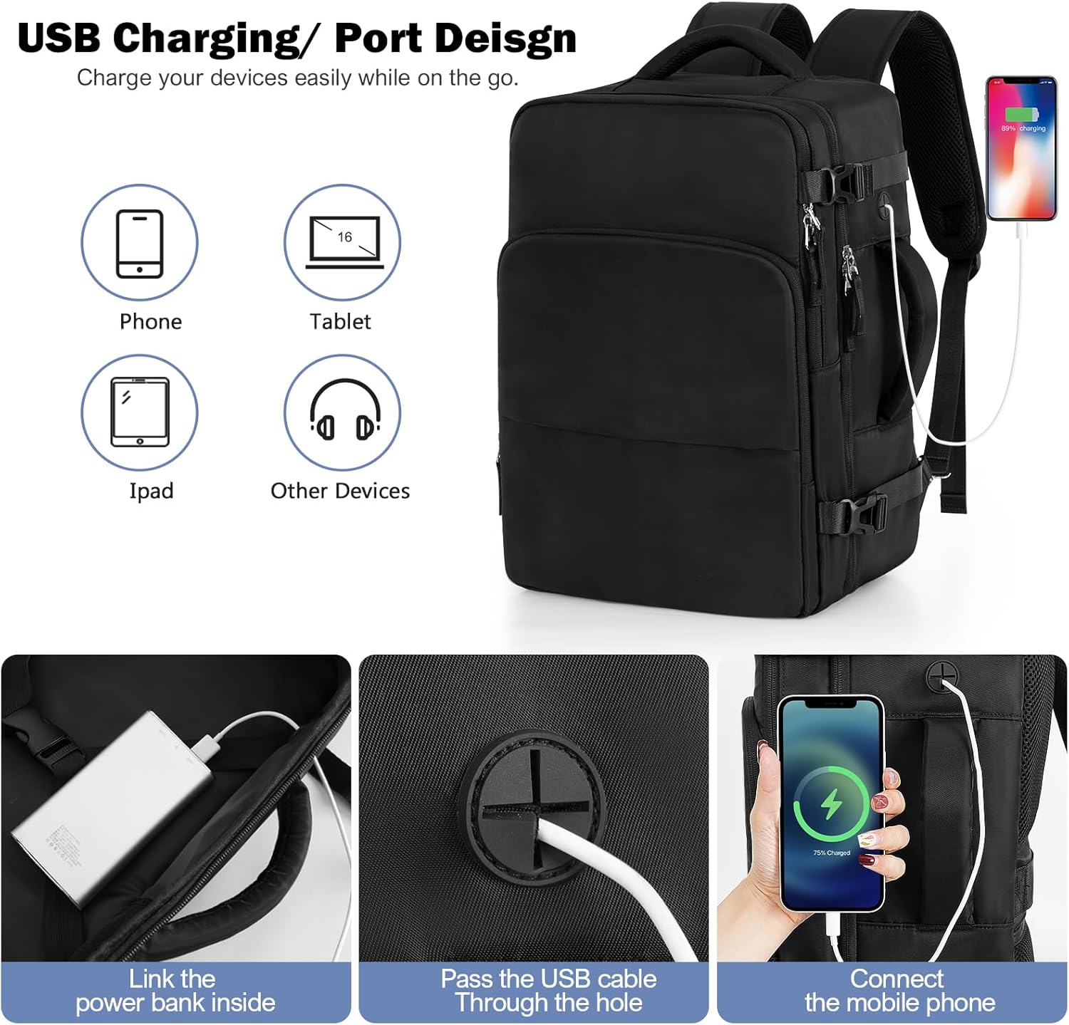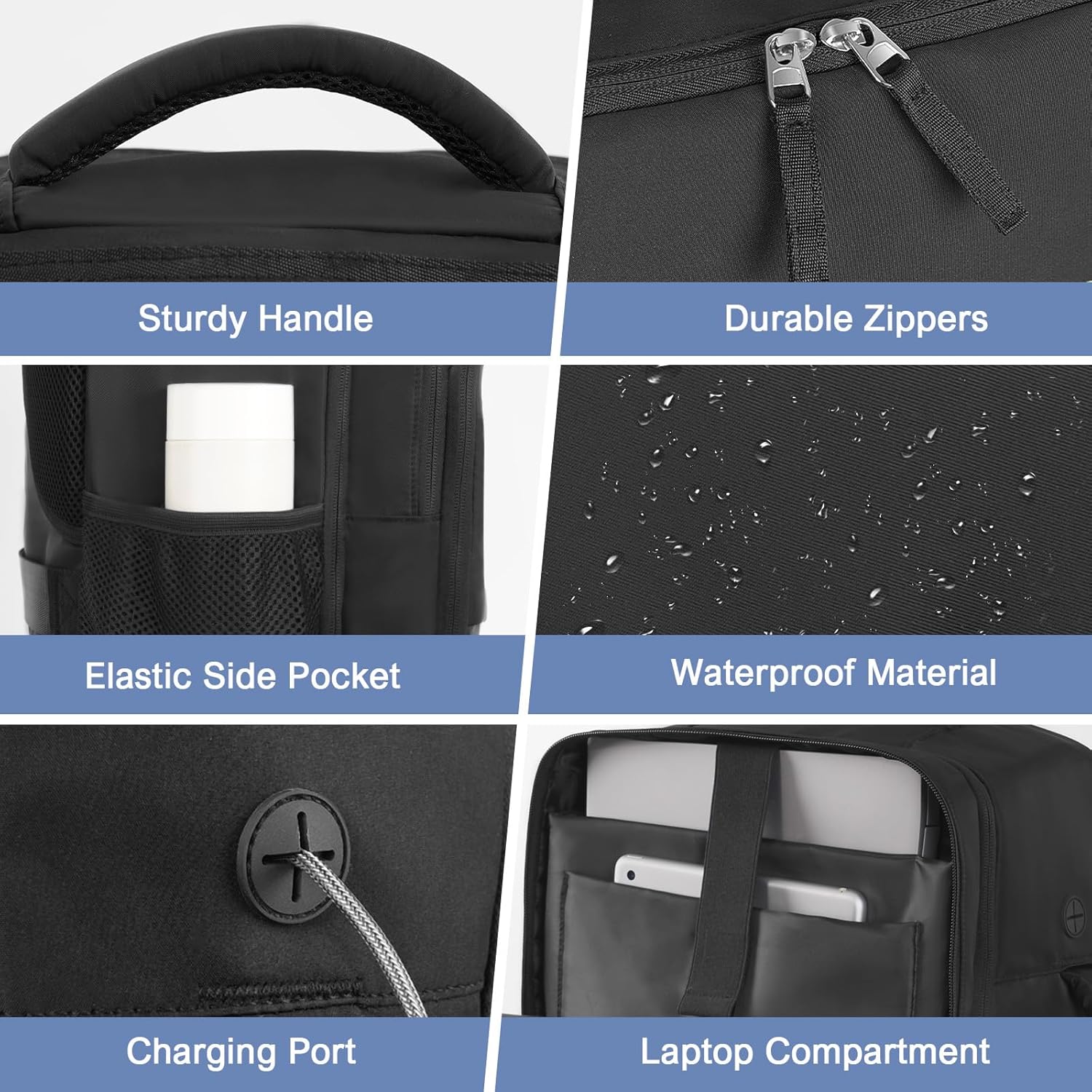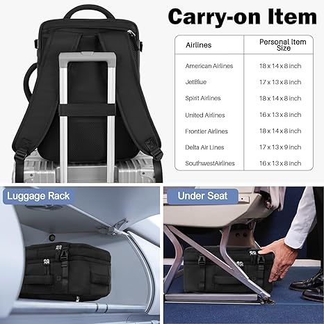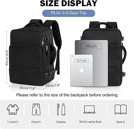 Men Black Rectangular Modern Sports Travel Backpack Daypack 15.6 Inch Laptop Backpack Carry On Airplane Weekender Bag 35L 5 Compartments Water Resistant Polyester Solid Black