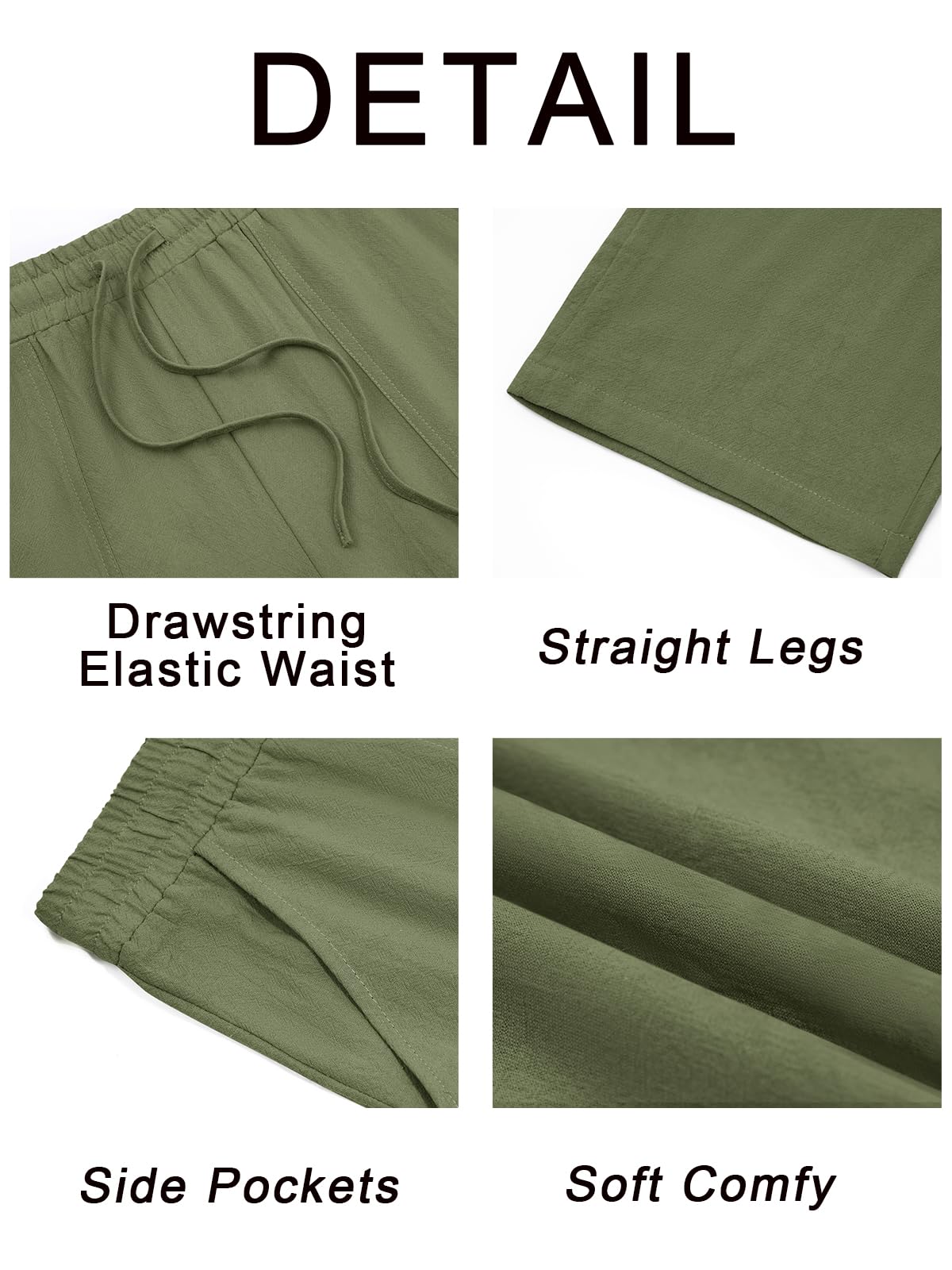 Mens Casual Pants Linen Drawstring Elastic Waist Loose Fit Straight Leg Pants Summer Beach V
