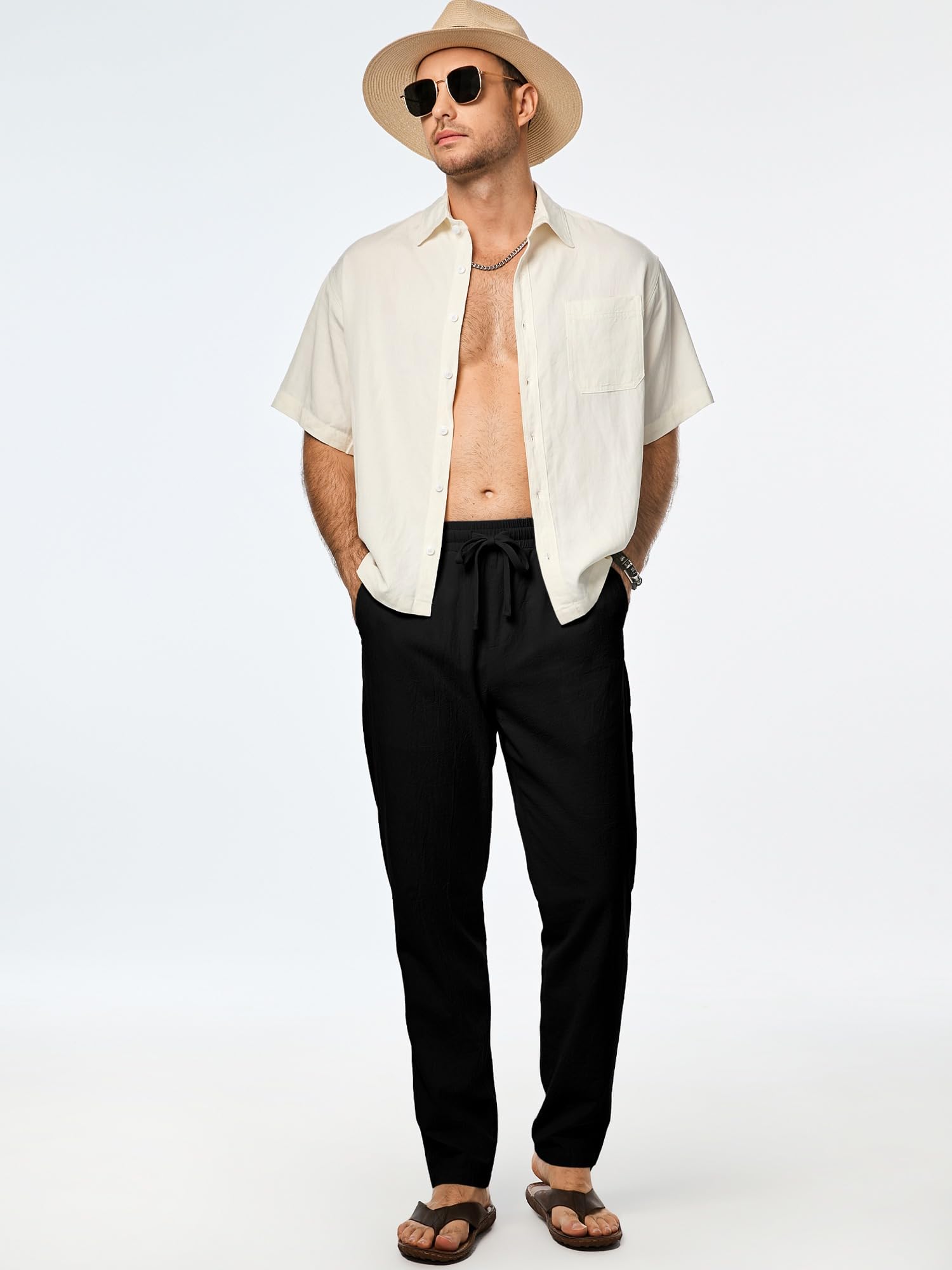 Mens Cotton Casual Trousers Elastic Waist Drawstring Lightweight Summer Beach Pants with Pockets