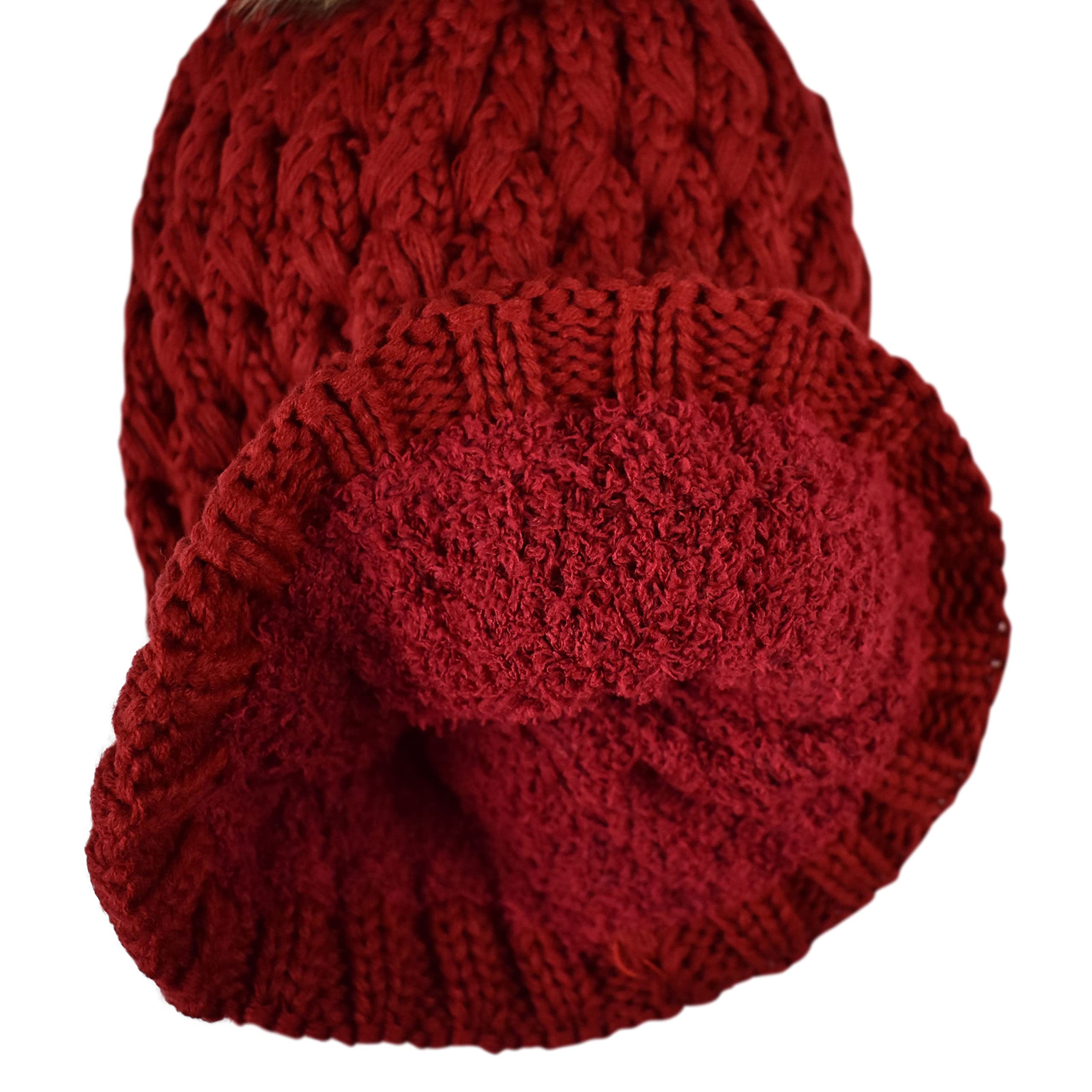 Thick and thick-walled knitted artificial fur pompom with wool lining, skull cap, cuffless brimmed hat