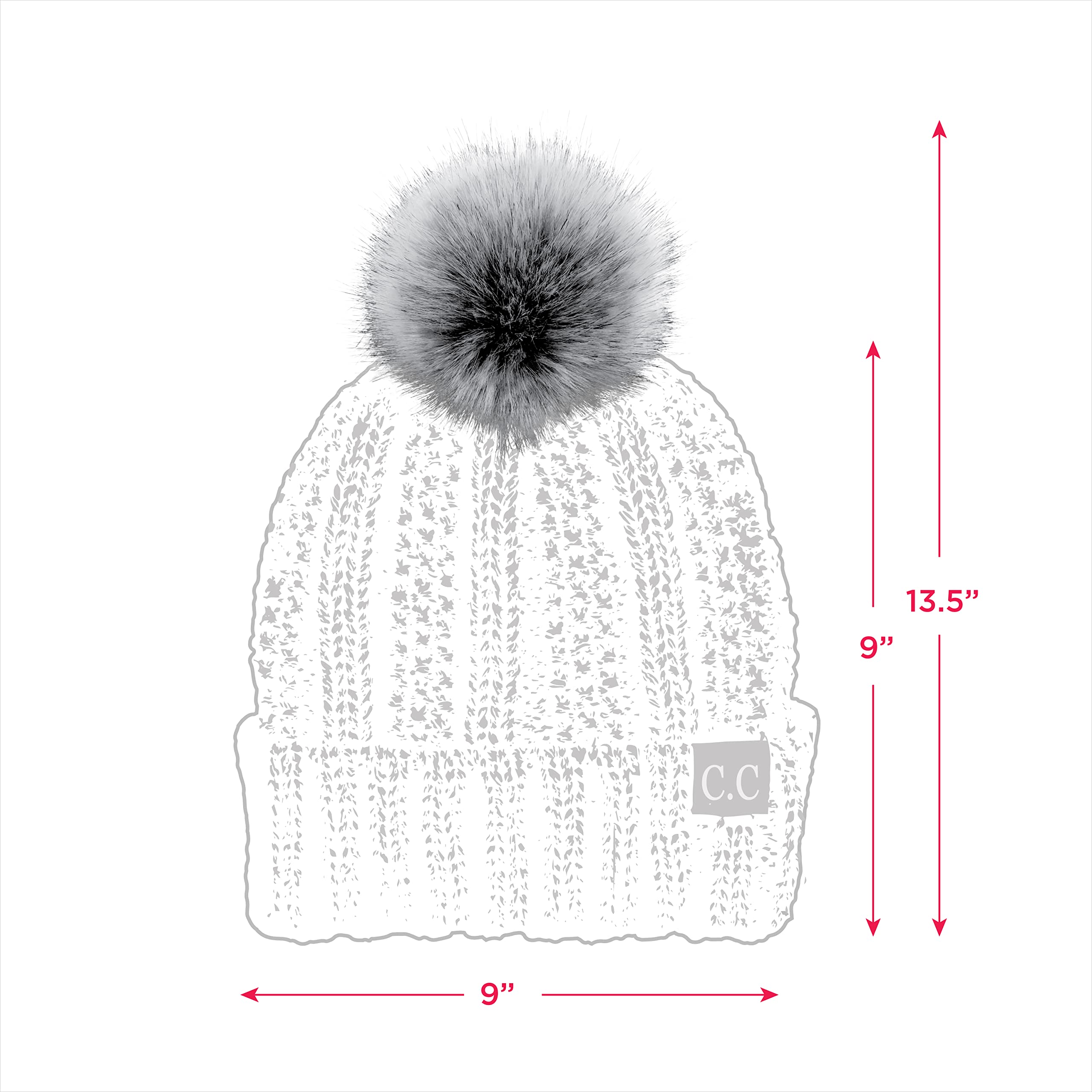 Thick and thick-walled knitted artificial fur pompom with wool lining, skull cap, cuffless brimmed hat
