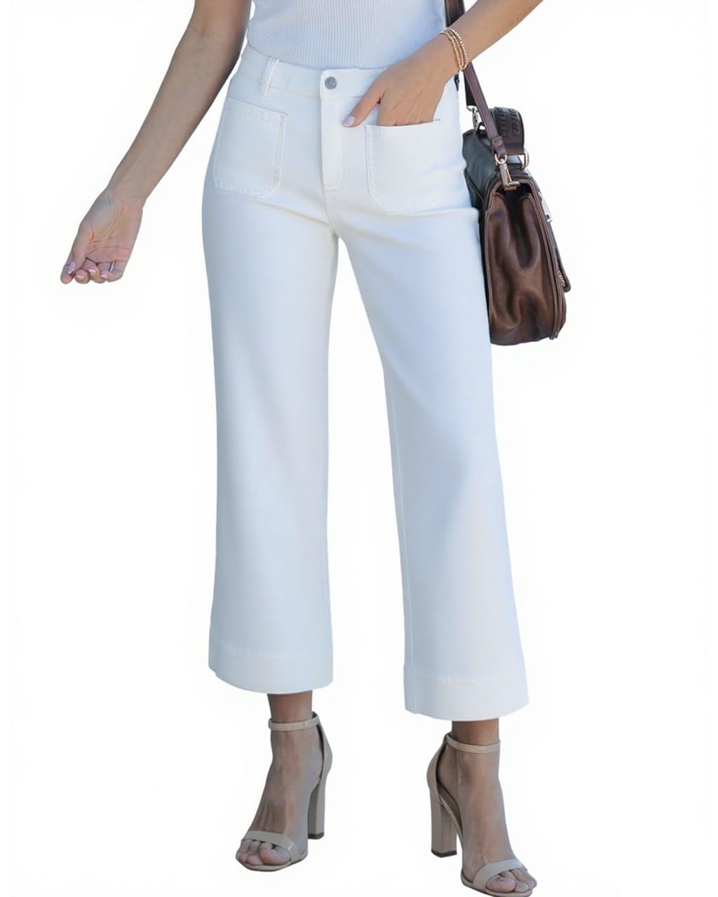 Wide Leg Jeans for Women Mid Waisted Straight Leg Stretchy Cropped Denim Pants with Patch Pockets Jeans