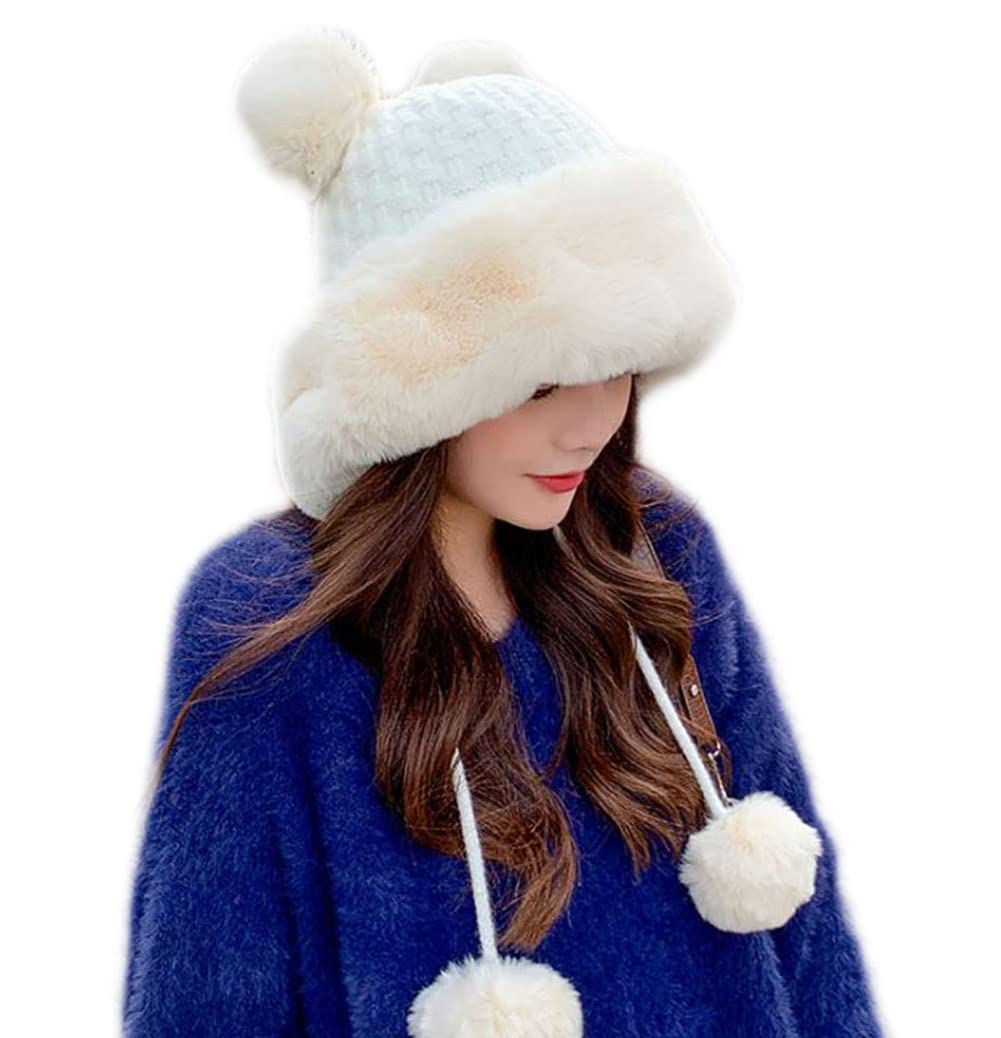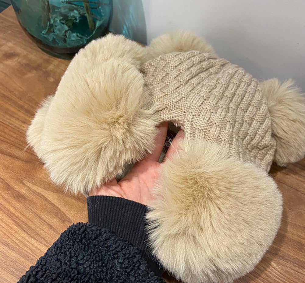 Winter pom-pom beanie for women, fluffy knitted women's beanie, faux fur crochet skull hat for warmth, bucket outdoor ear cover