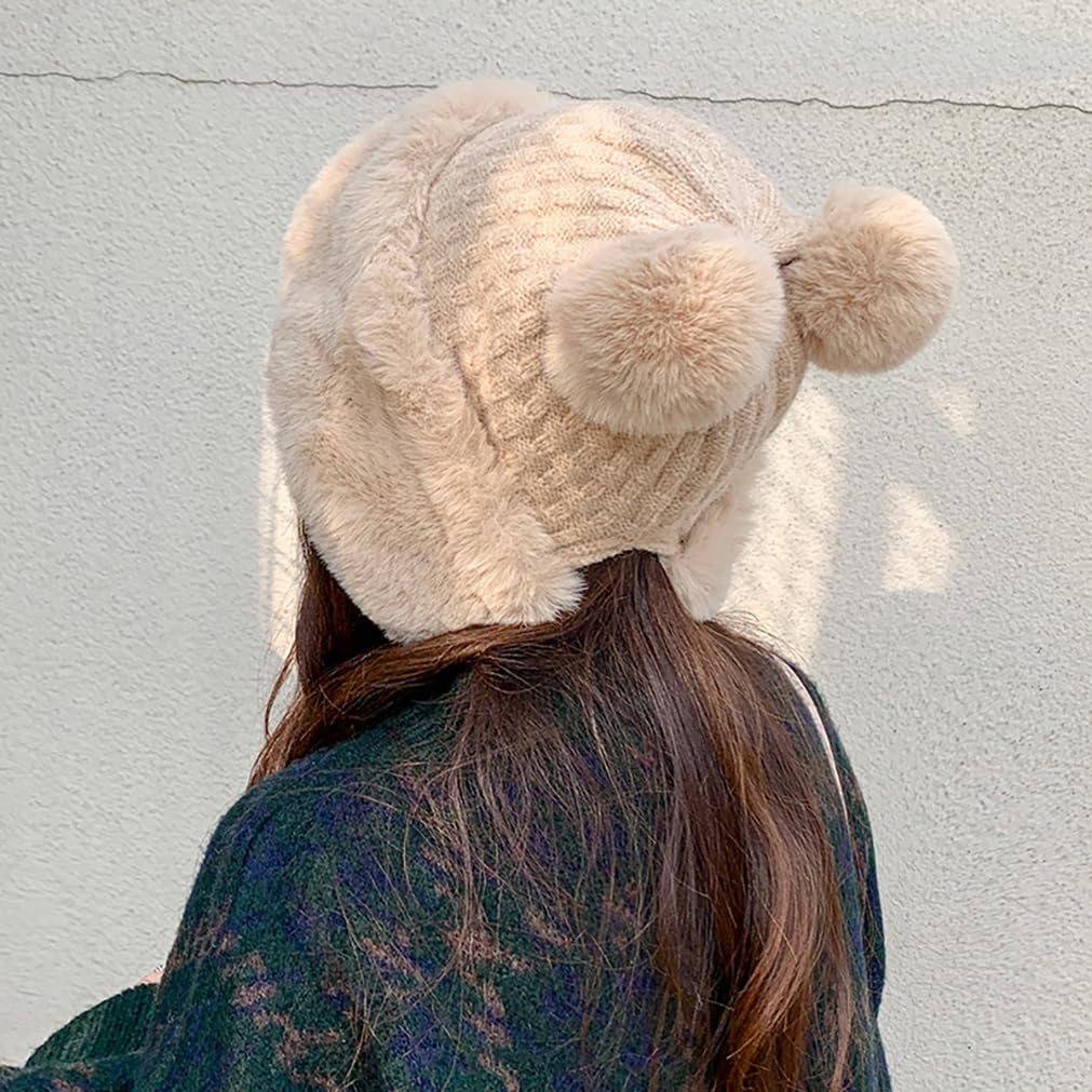 Winter pom-pom beanie for women, fluffy knitted women's beanie, faux fur crochet skull hat for warmth, bucket outdoor ear cover