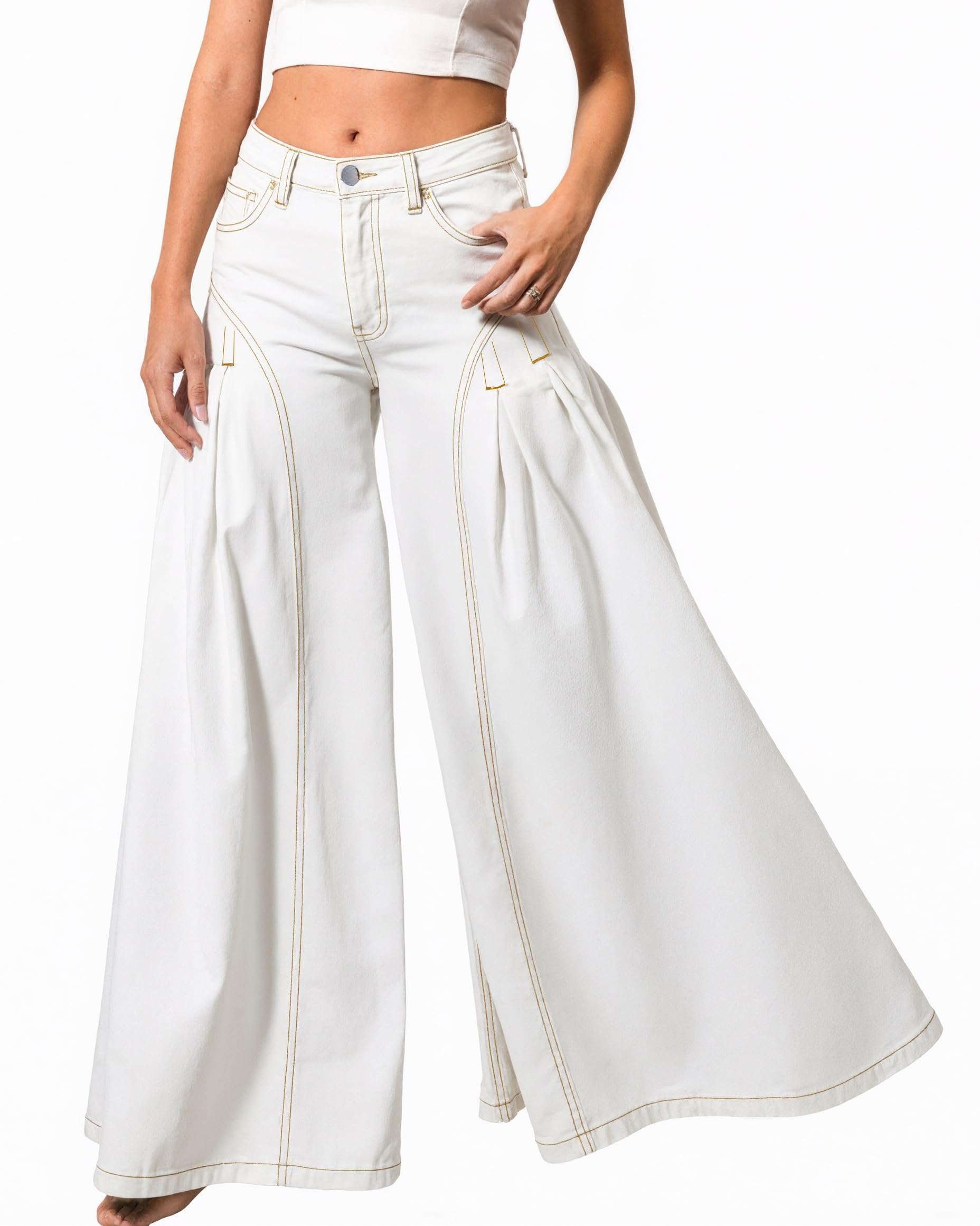 Women Bell Bottom Jeans High Waist Stretch Wide Leg Baggy Flared Pleated Vintage Casual Loose Denim Pants