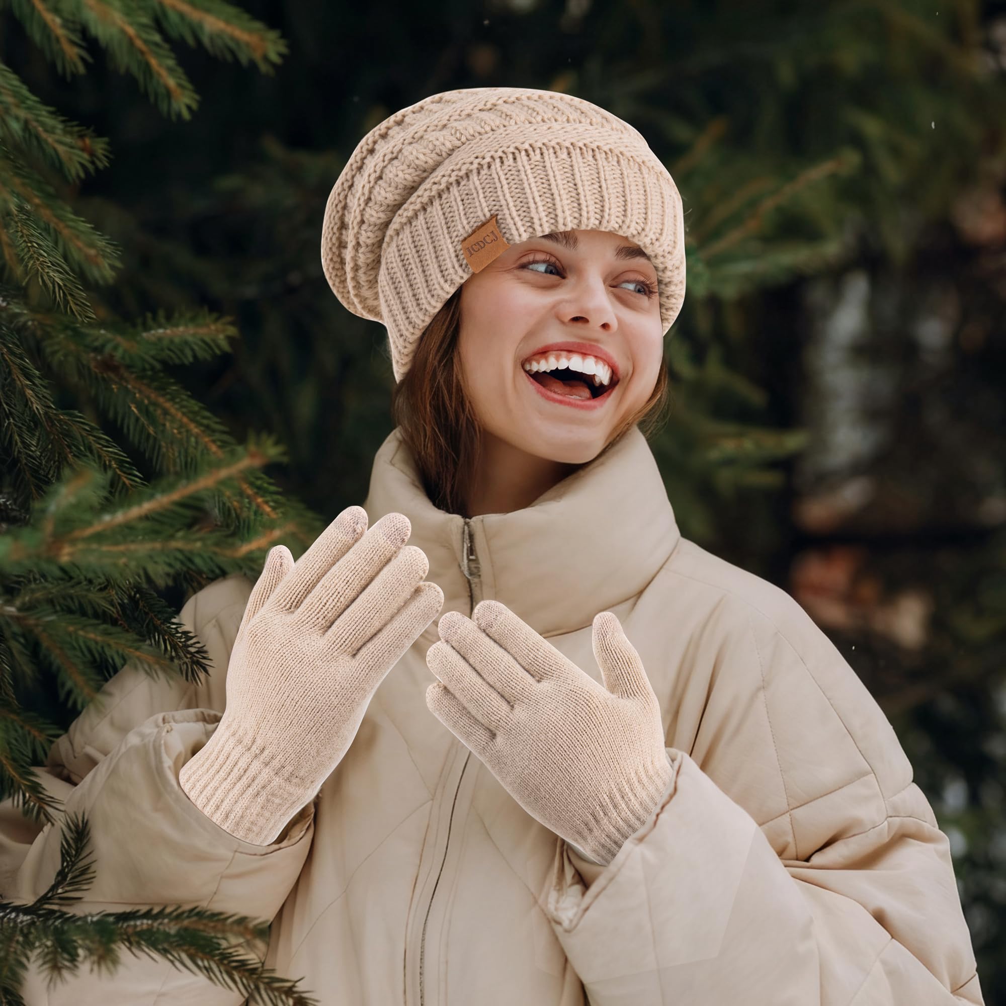 Women's beanie scarf, gloves set with wool lining for winter. Long knitted scarf for neck warmth. Touchscreen gloves