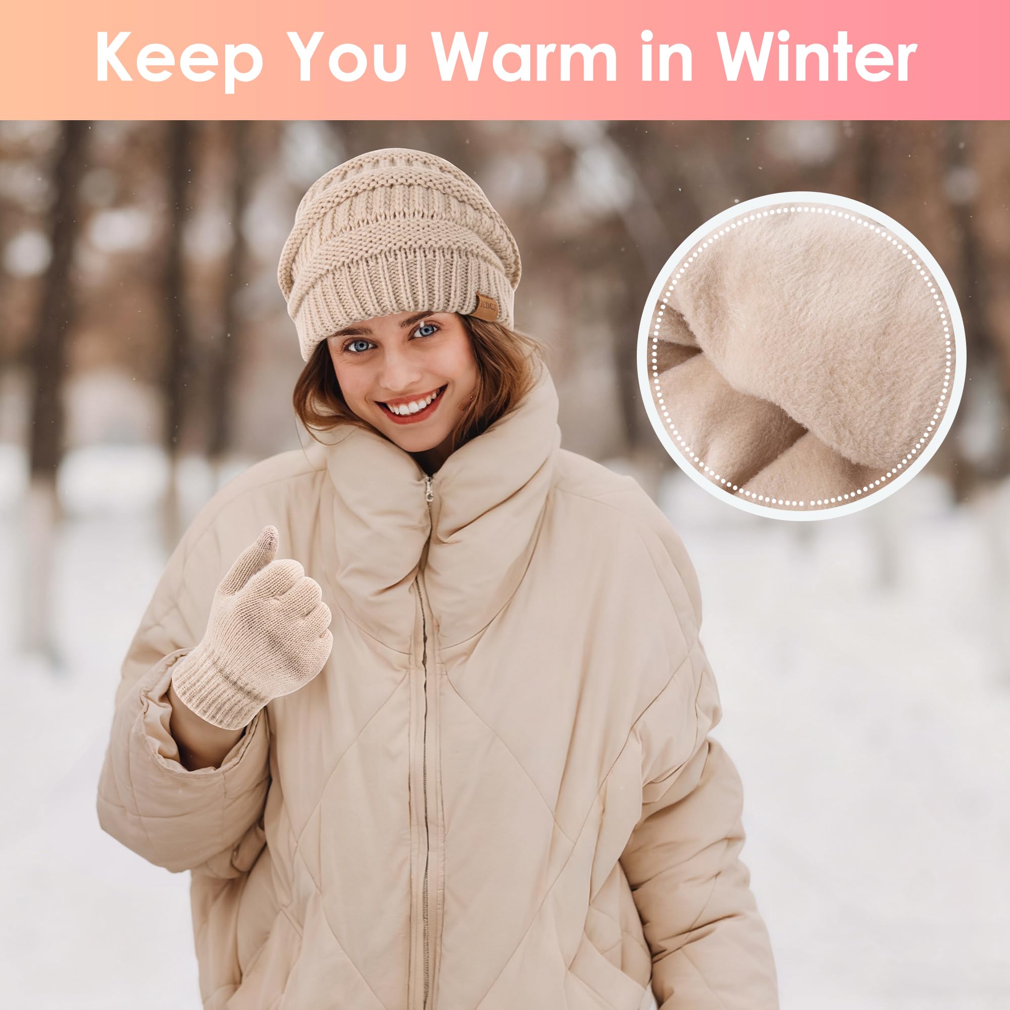 Women's beanie scarf, gloves set with wool lining for winter. Long knitted scarf for neck warmth. Touchscreen gloves