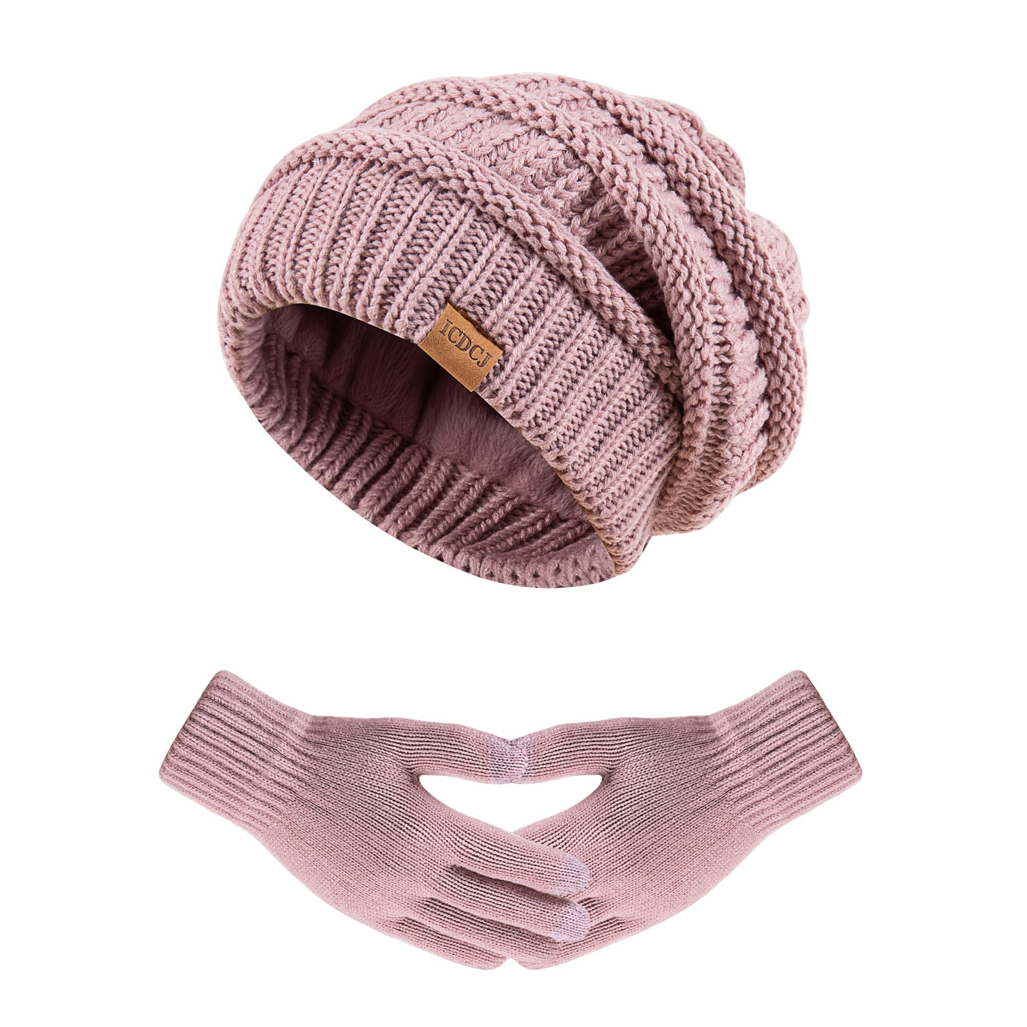 Women's beanie scarf, gloves set with wool lining for winter. Long knitted scarf for neck warmth. Touchscreen gloves