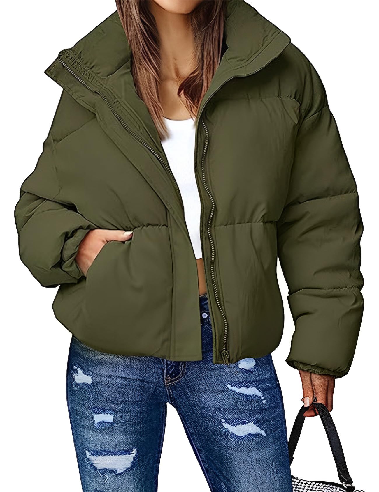 Women's Cropped Puffer Jackets Casual Padded Jacket Long Sleeve Full Zip Stand Collar Winter Coat