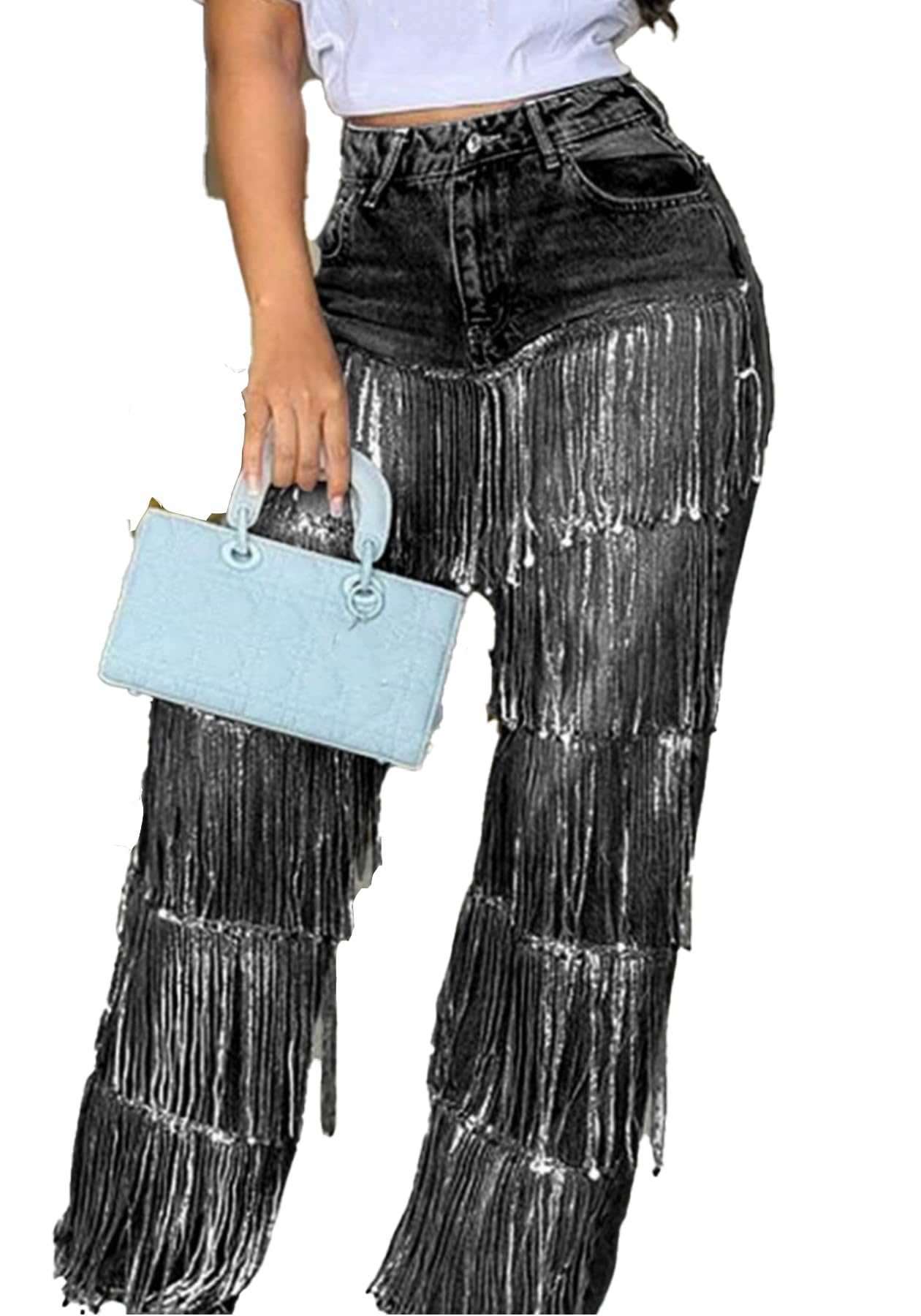 Women's High Waisted Sequin Fringe Jeans Baggy Straight Leg Sparkly Tassels Denim Pants Y2K Streetwear