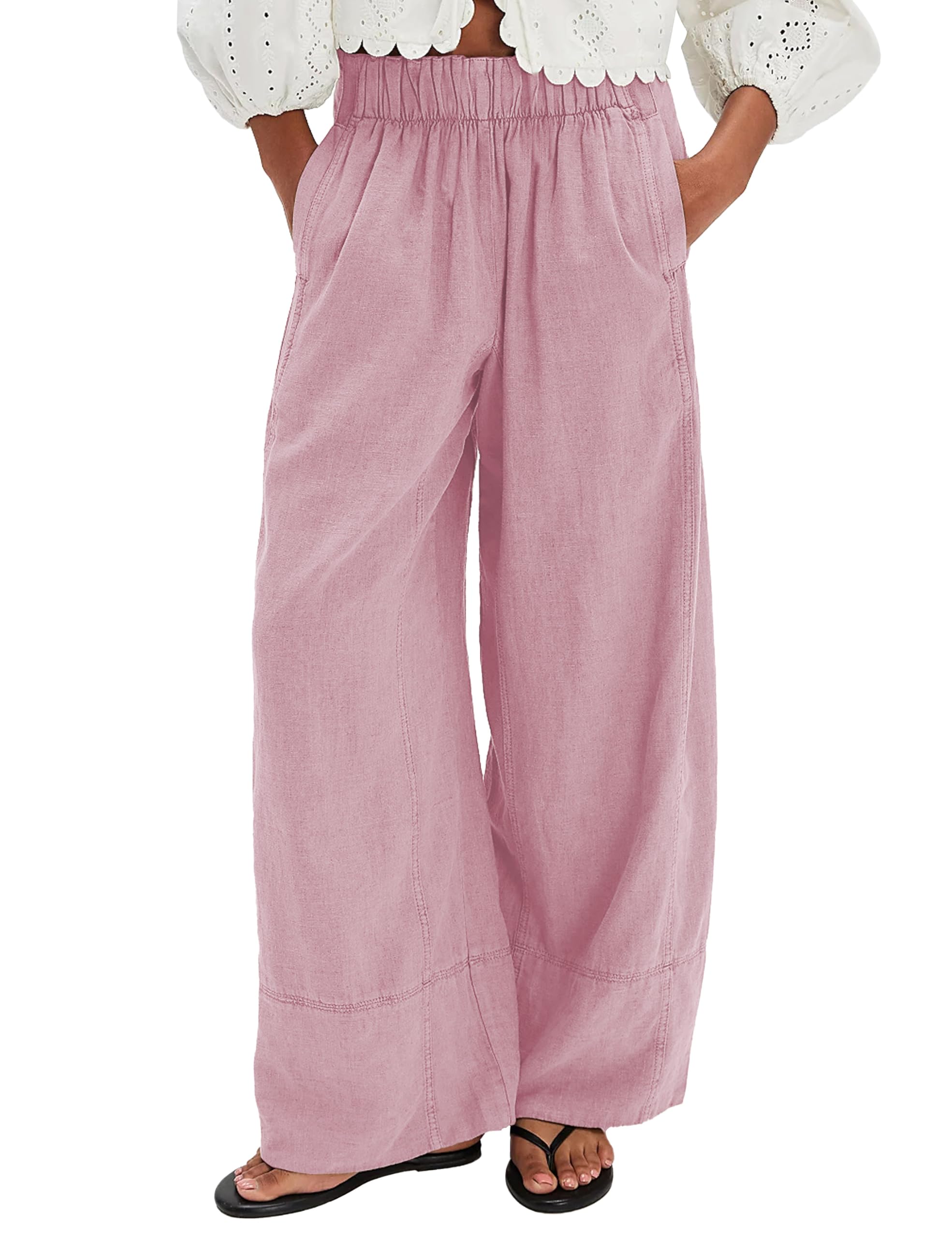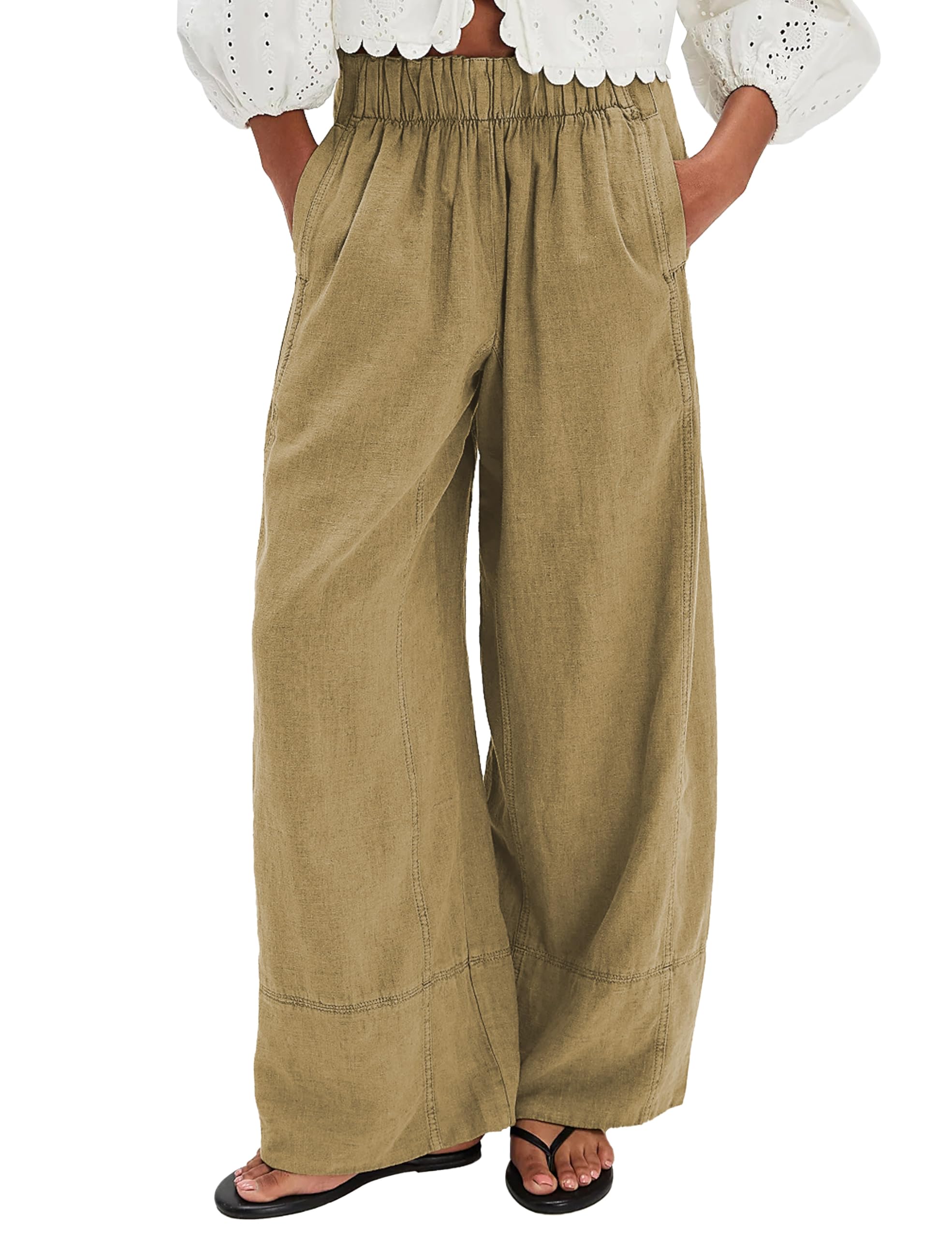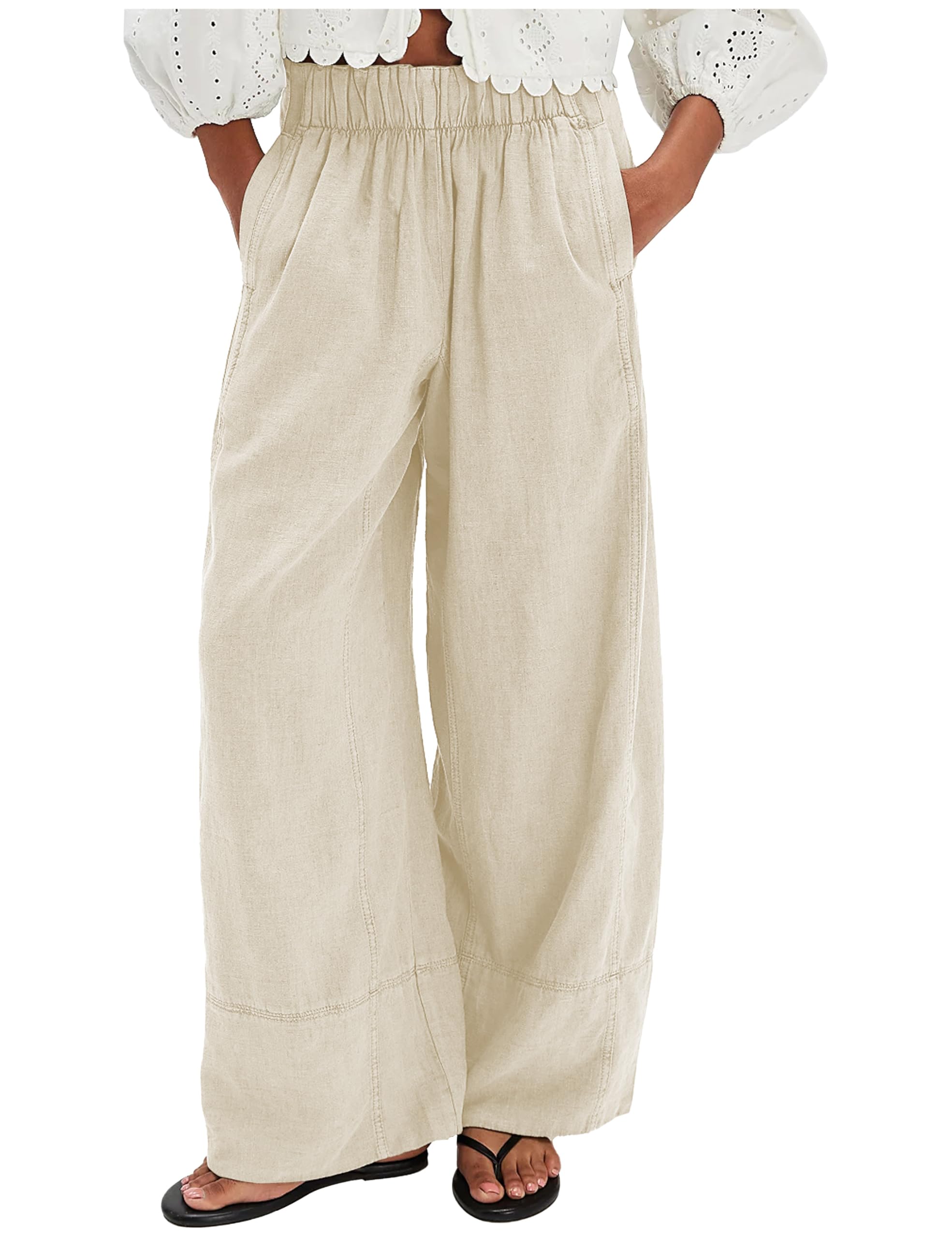 Women's Linen Wide Leg Pants Elastic Waist Summer Boho Palazzo Pants Beach Vacation Casual Trousers with Pockets
