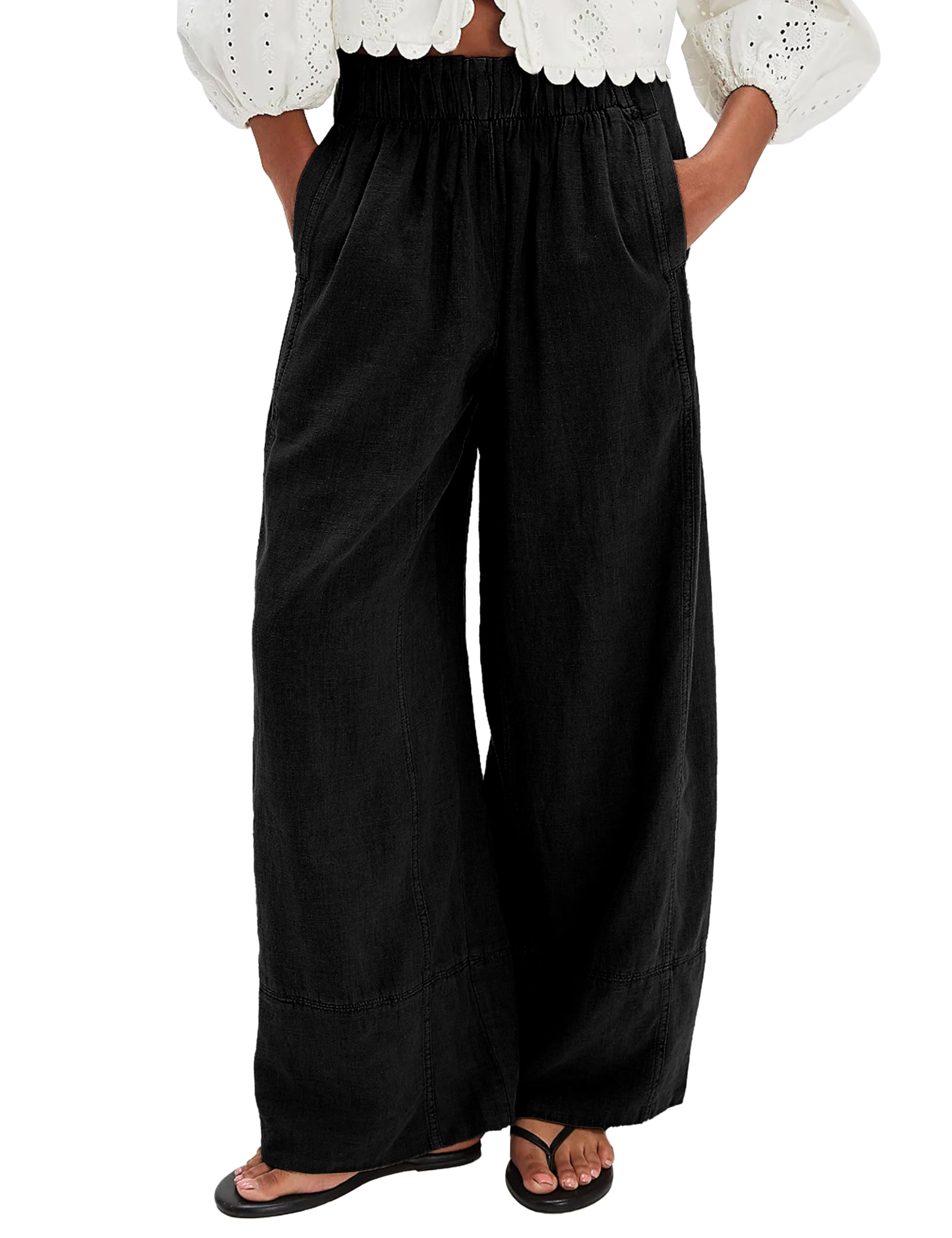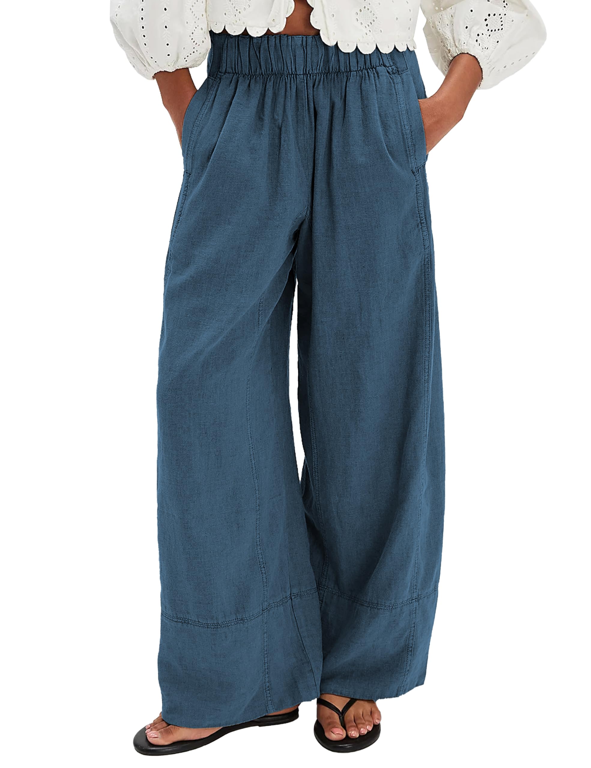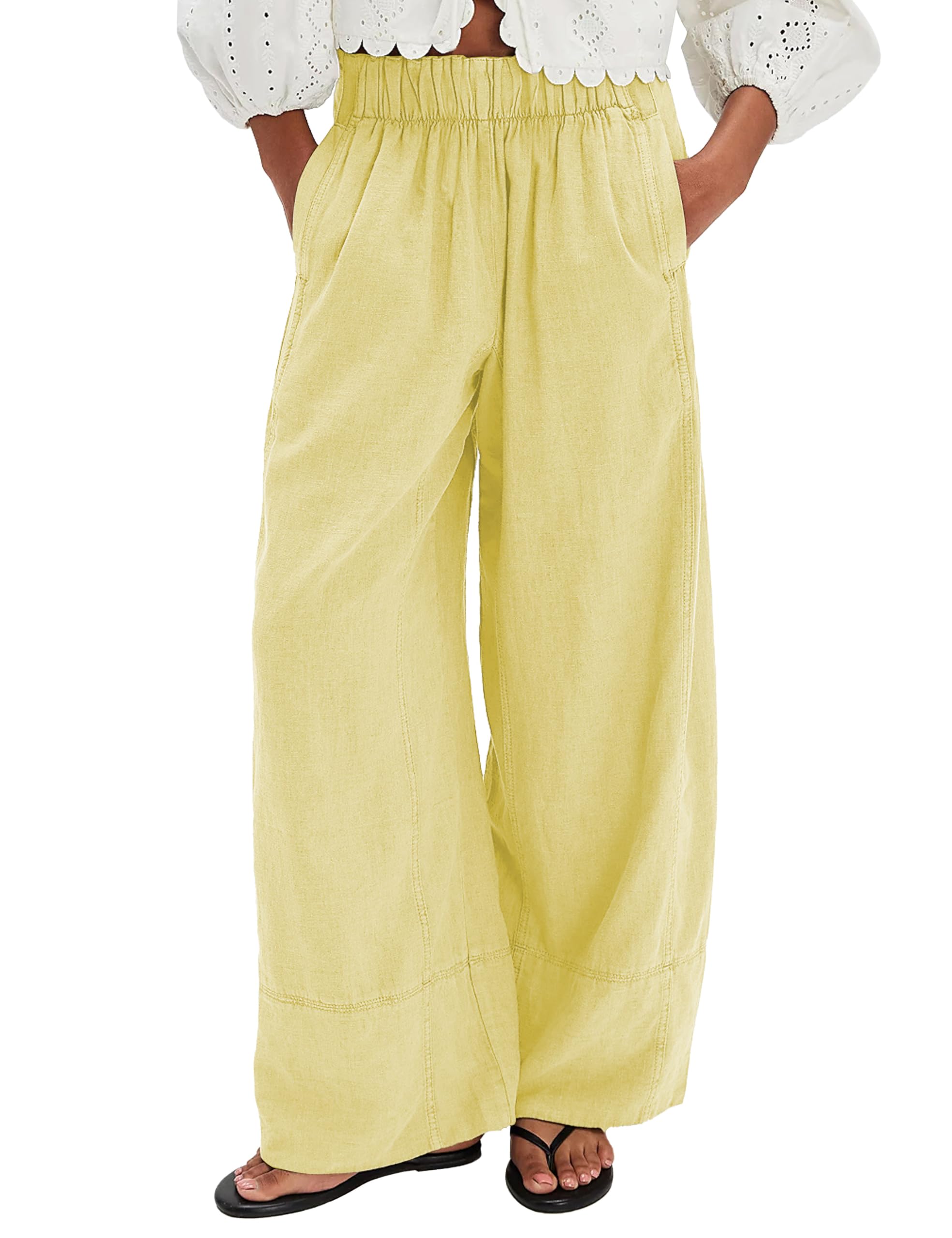 Women's Linen Wide Leg Pants Elastic Waist Summer Boho Palazzo Pants Beach Vacation Casual Trousers with Pockets