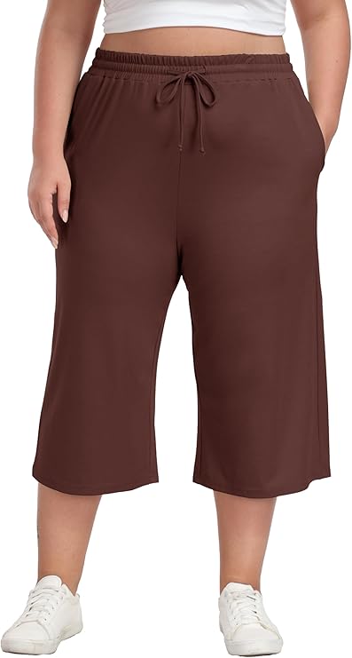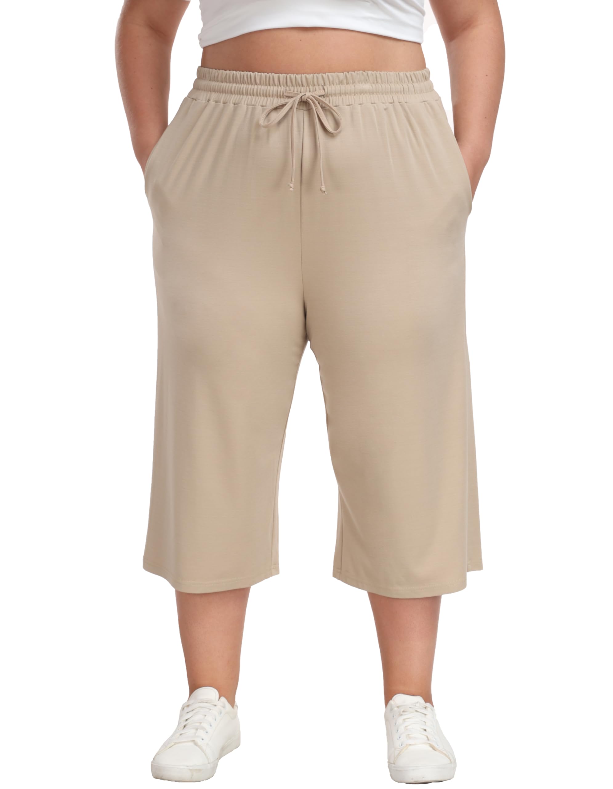 Women's Plus Size Capri Pants Summer Loose Fit Casual Pants Elastic Waist Yoga Pants with Pockets Drawstring