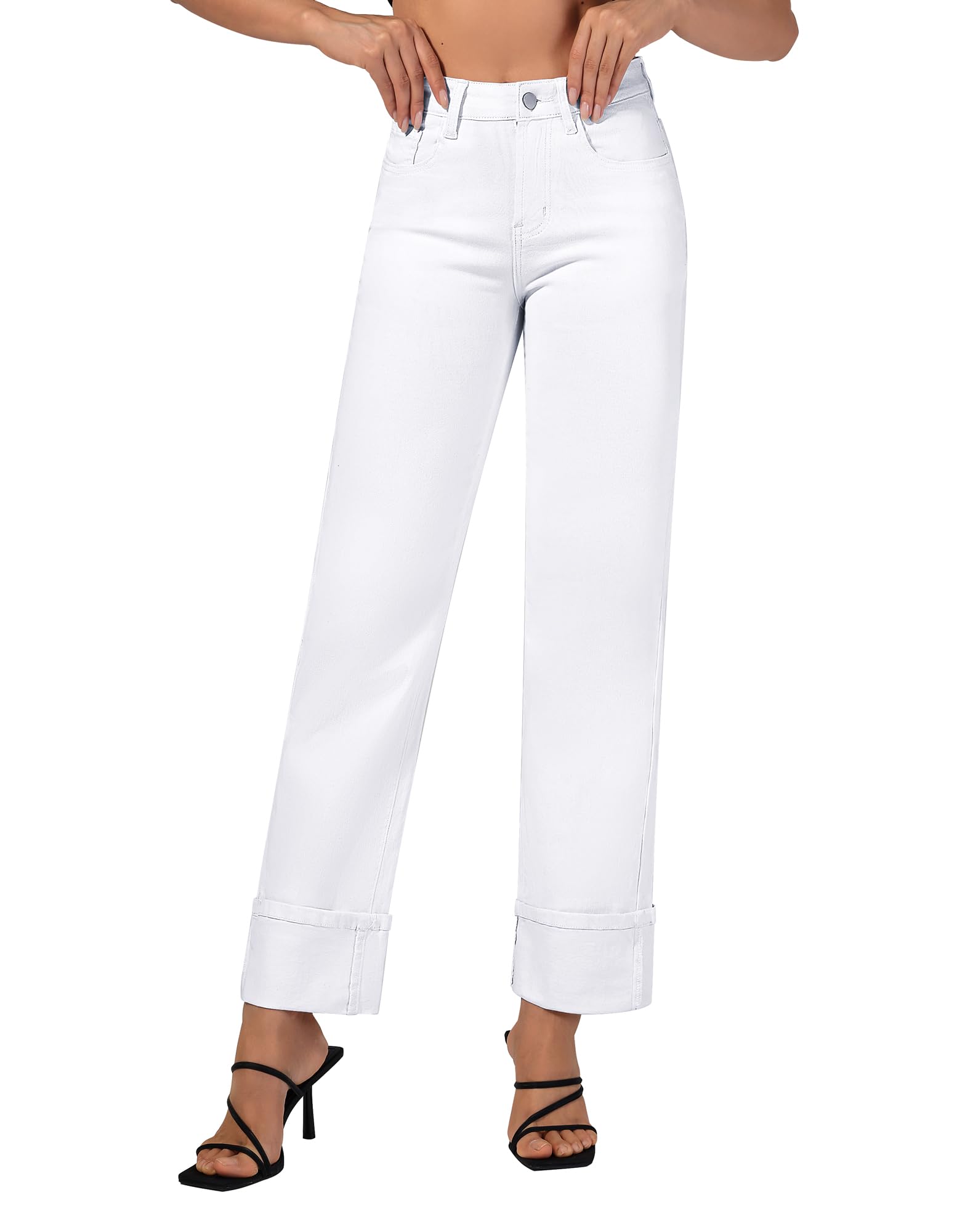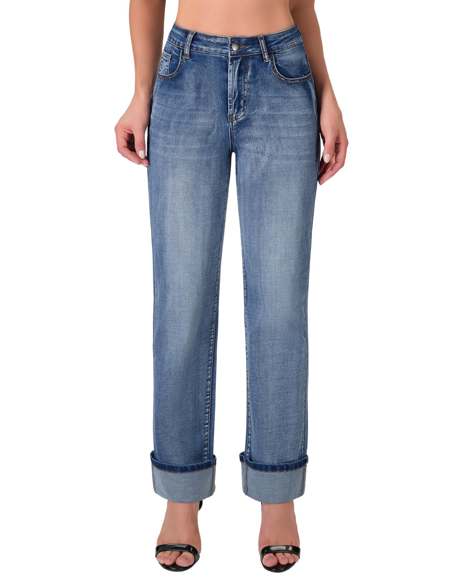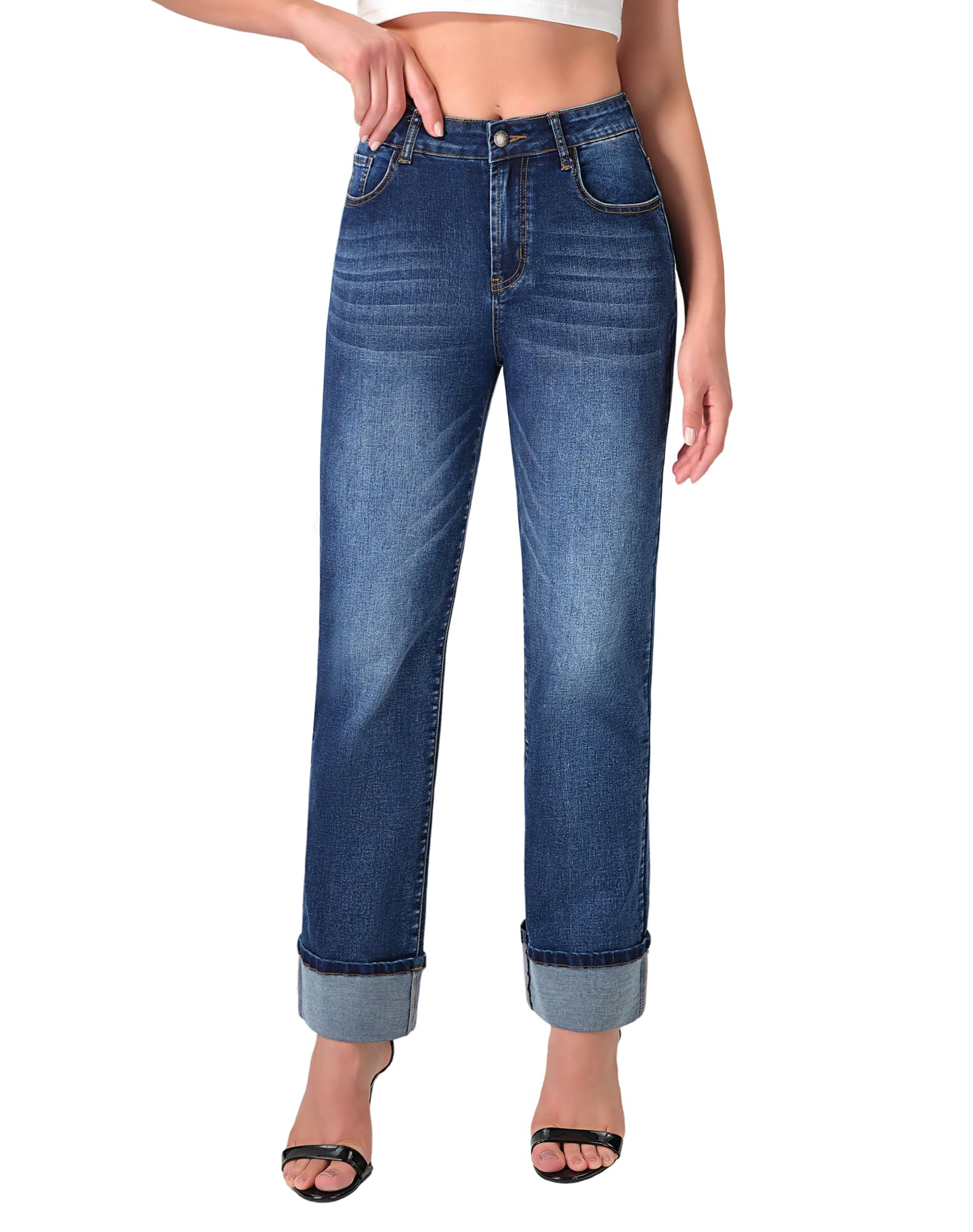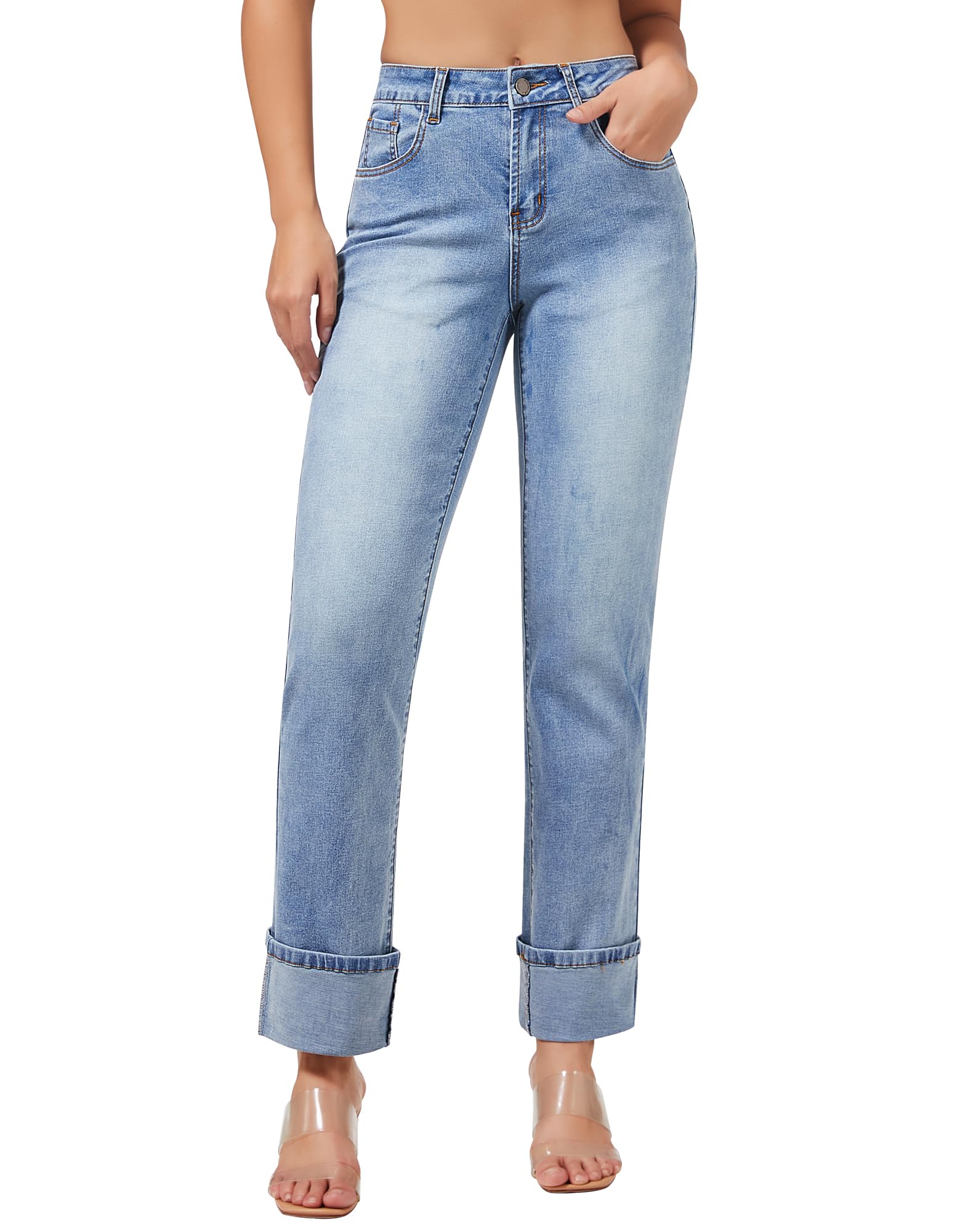Women’s Straight Leg Jeans High Waisted Boyfriend Stretchy Cuffed Denim Pants
