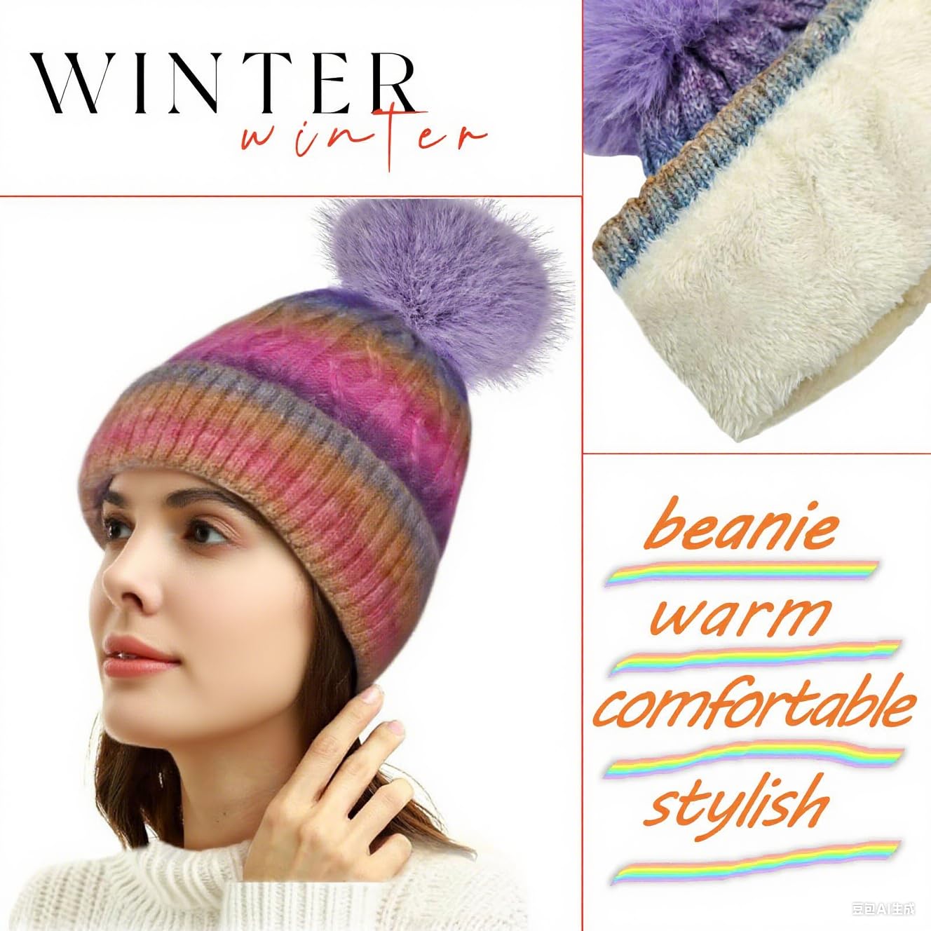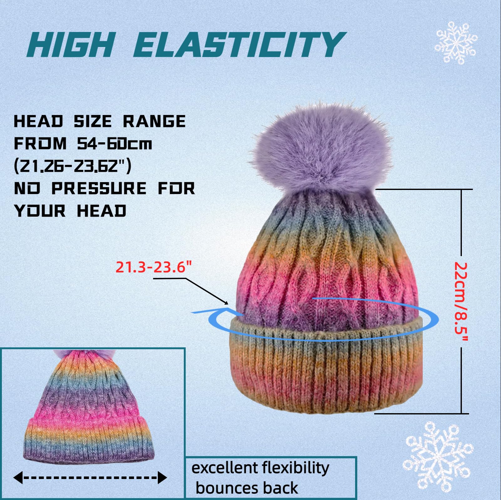 Women's winter brimless hat - Fleece inner layer, chunky knit Pom-Pom long sock hat, suitable for girls in cold weather