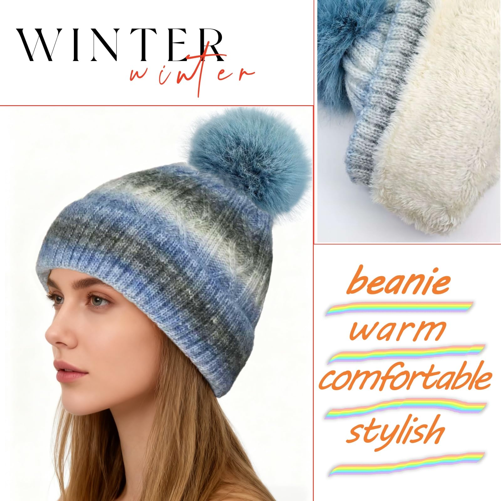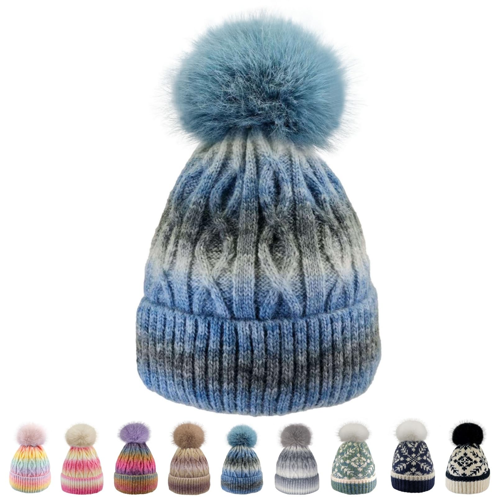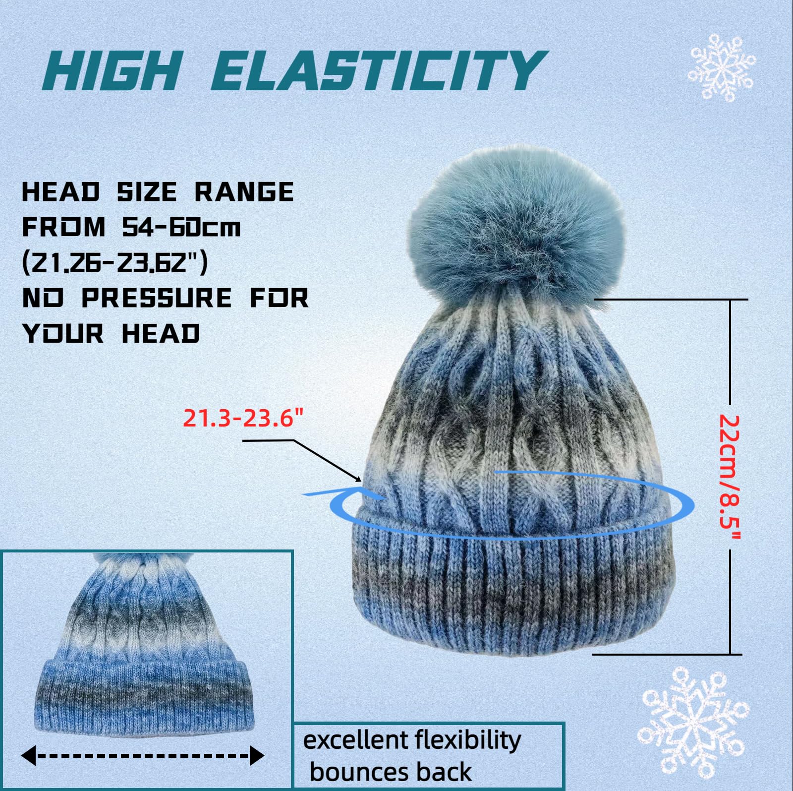 Women's winter brimless hat - Fleece inner layer, chunky knit Pom-Pom long sock hat, suitable for girls in cold weather