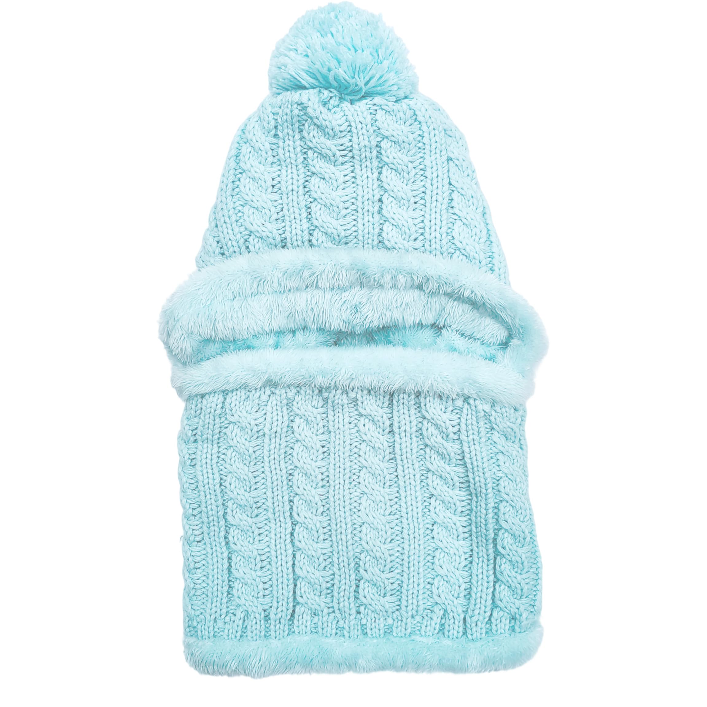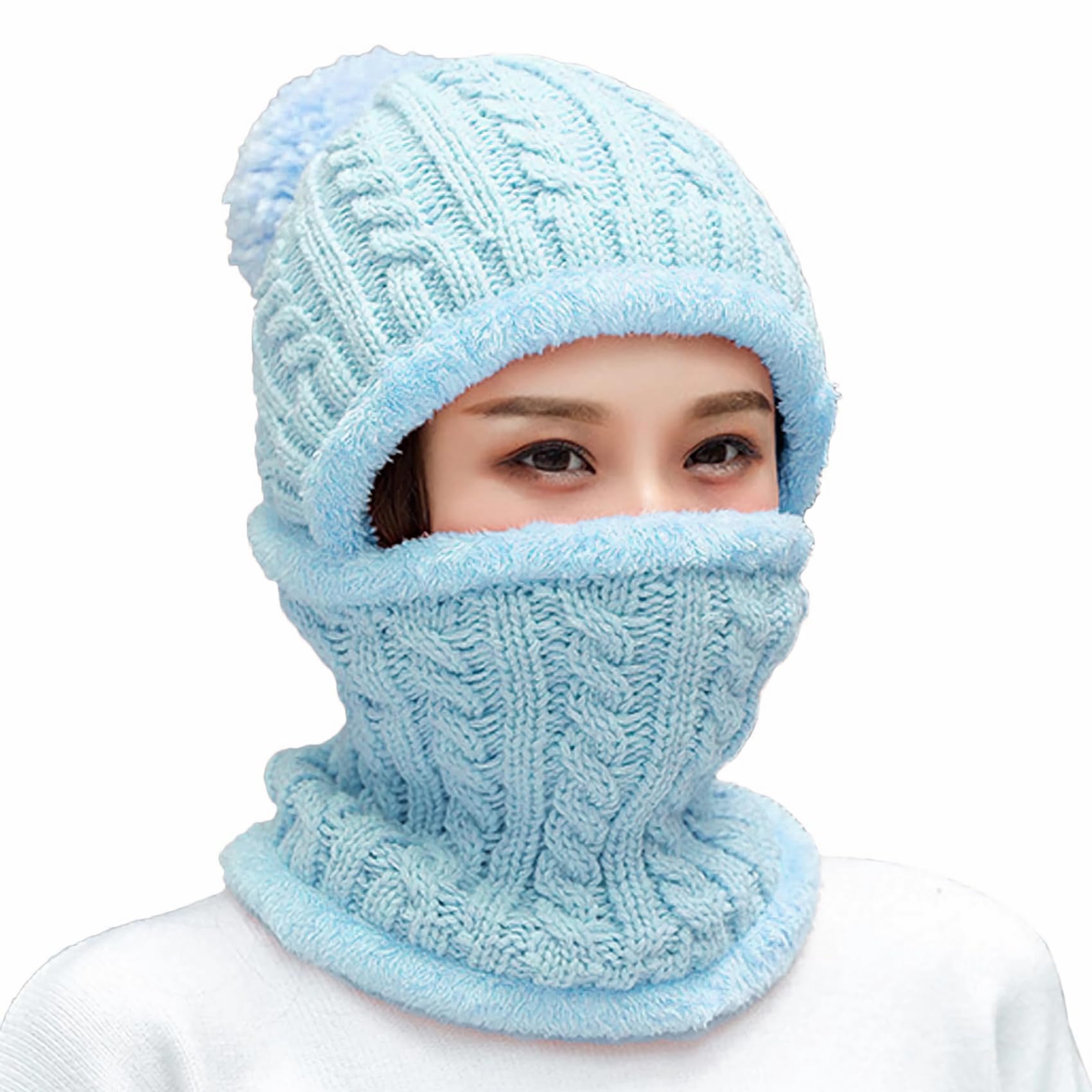 Women's winter unhooded woolen-lined knitted beret mask set with skull collar and round scarf, ski hat with pom-poms