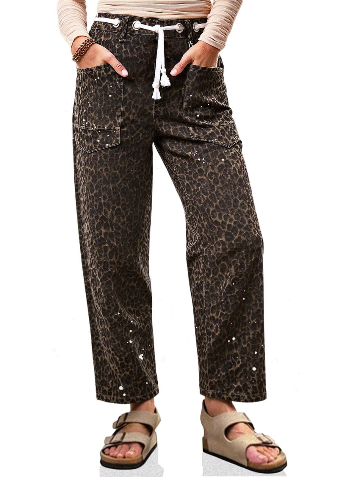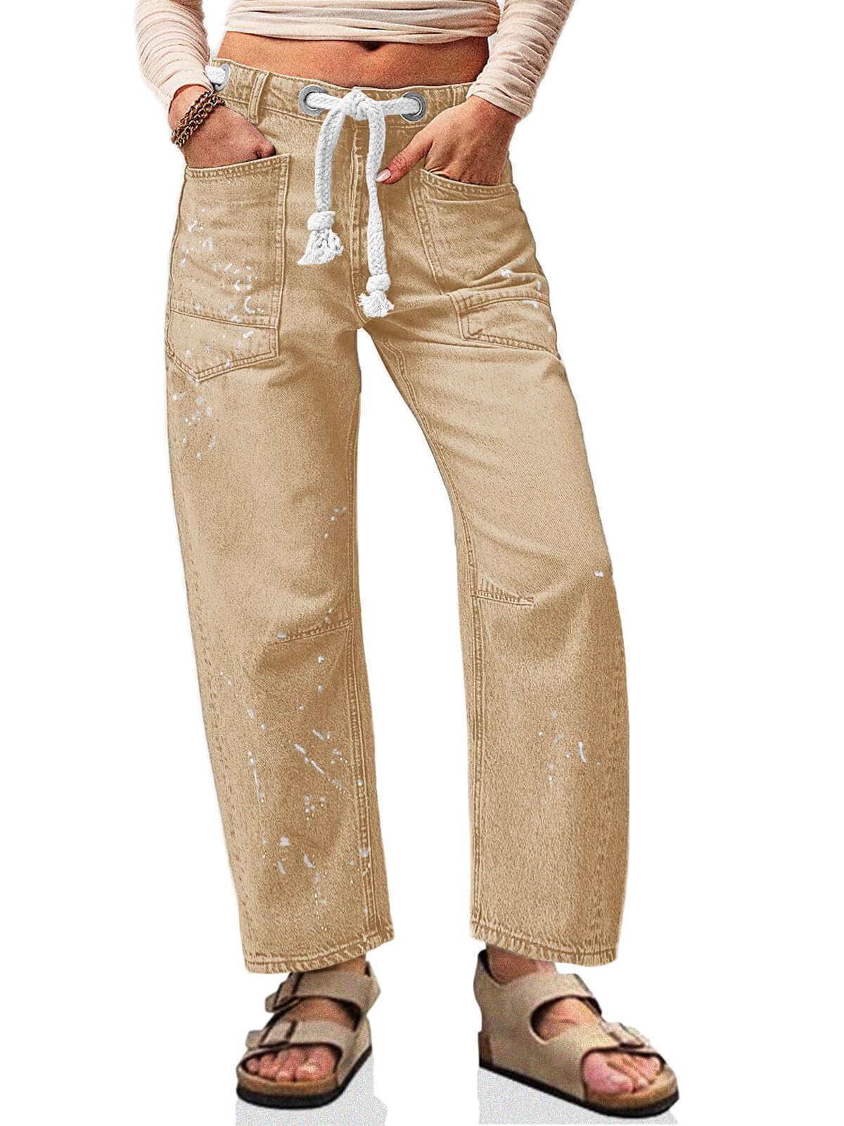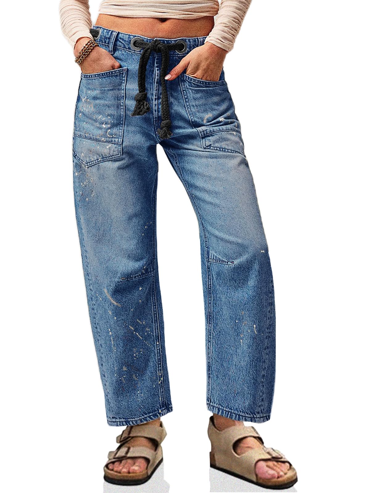 Womens Baggy Barrel Horseshoe Jeans Wide Leg Drawstring Vintage Denim Pants with Front Pockets