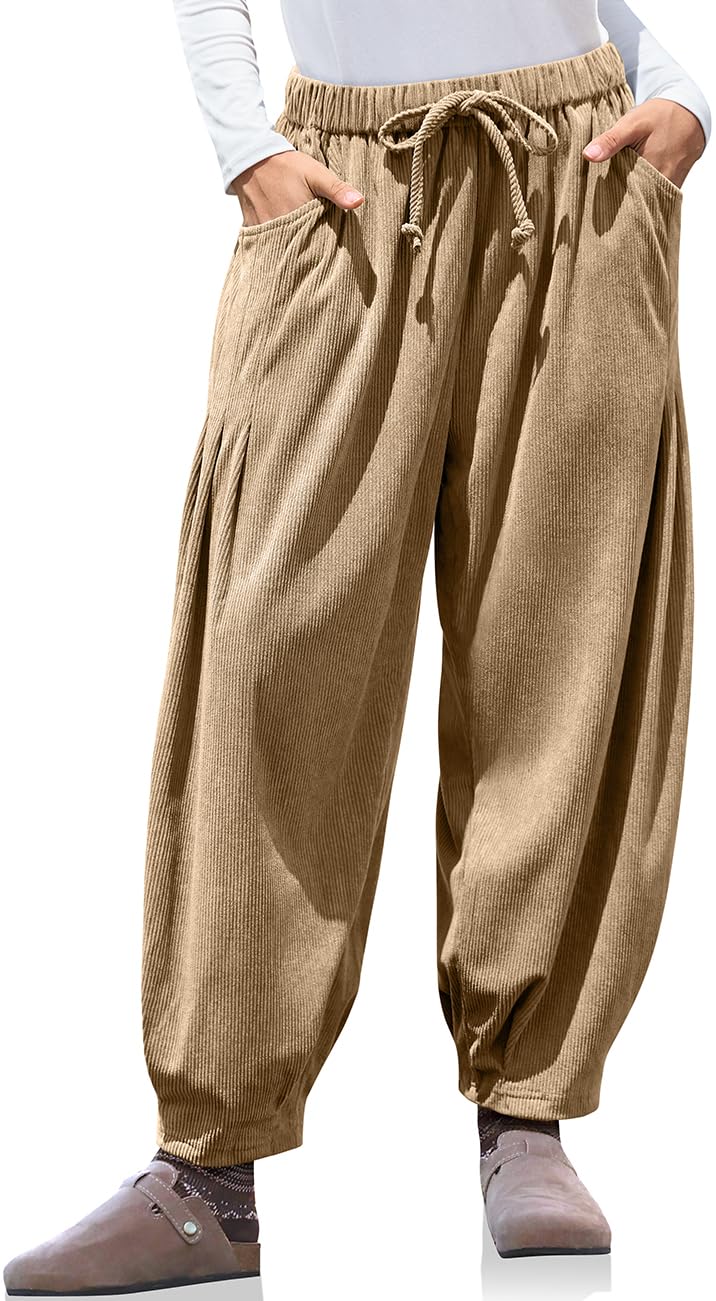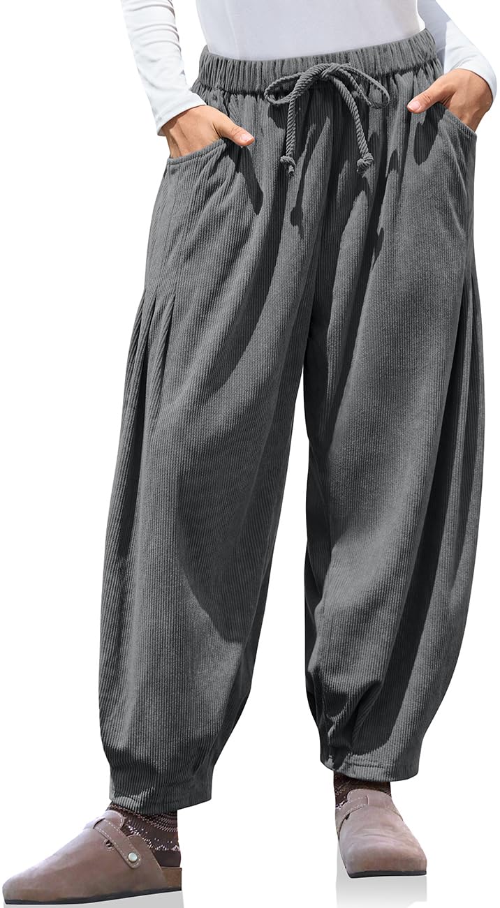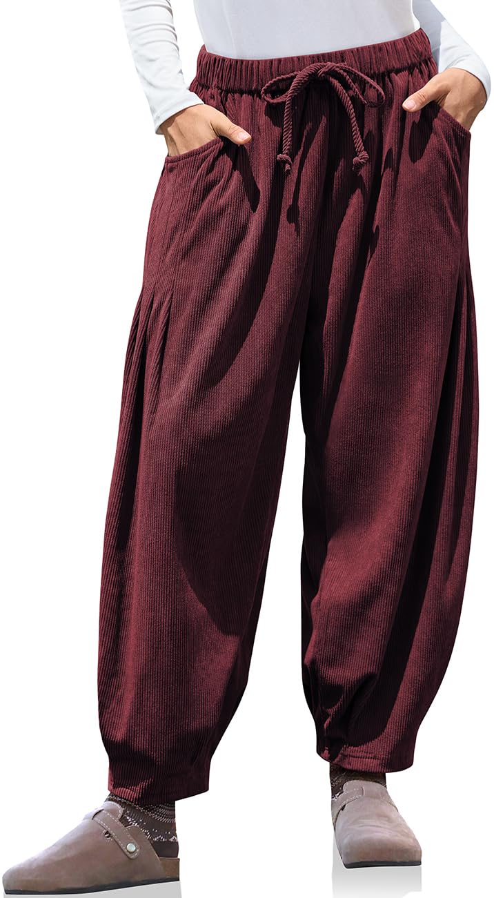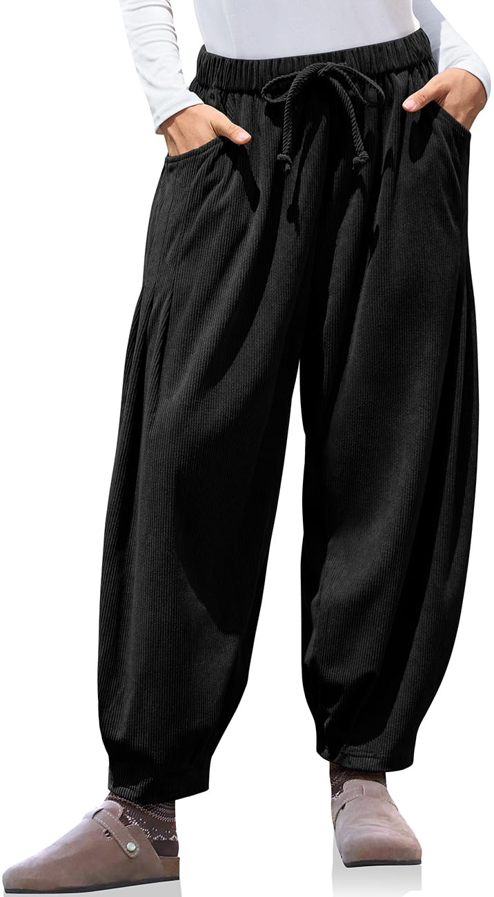 Womens Baggy Wide Leg Pants Corduroy Casual Drawstring Waist Palazzo Harem Pants with Pockets