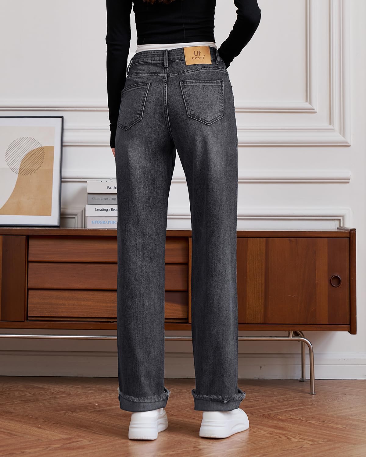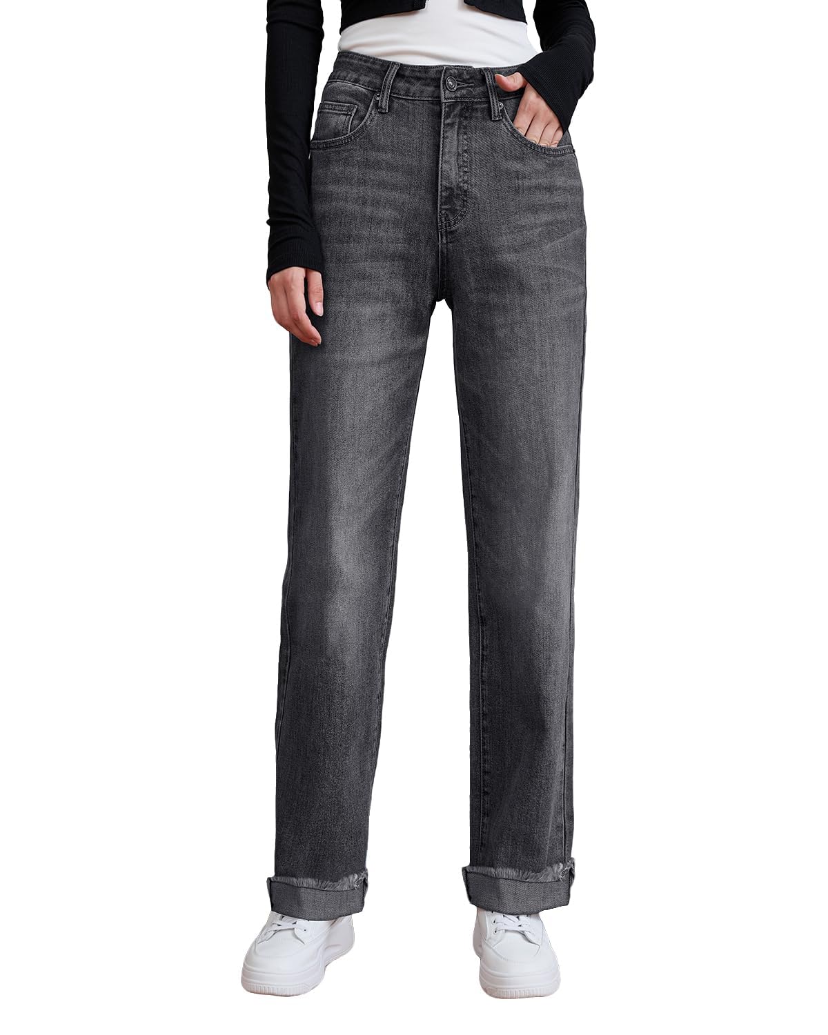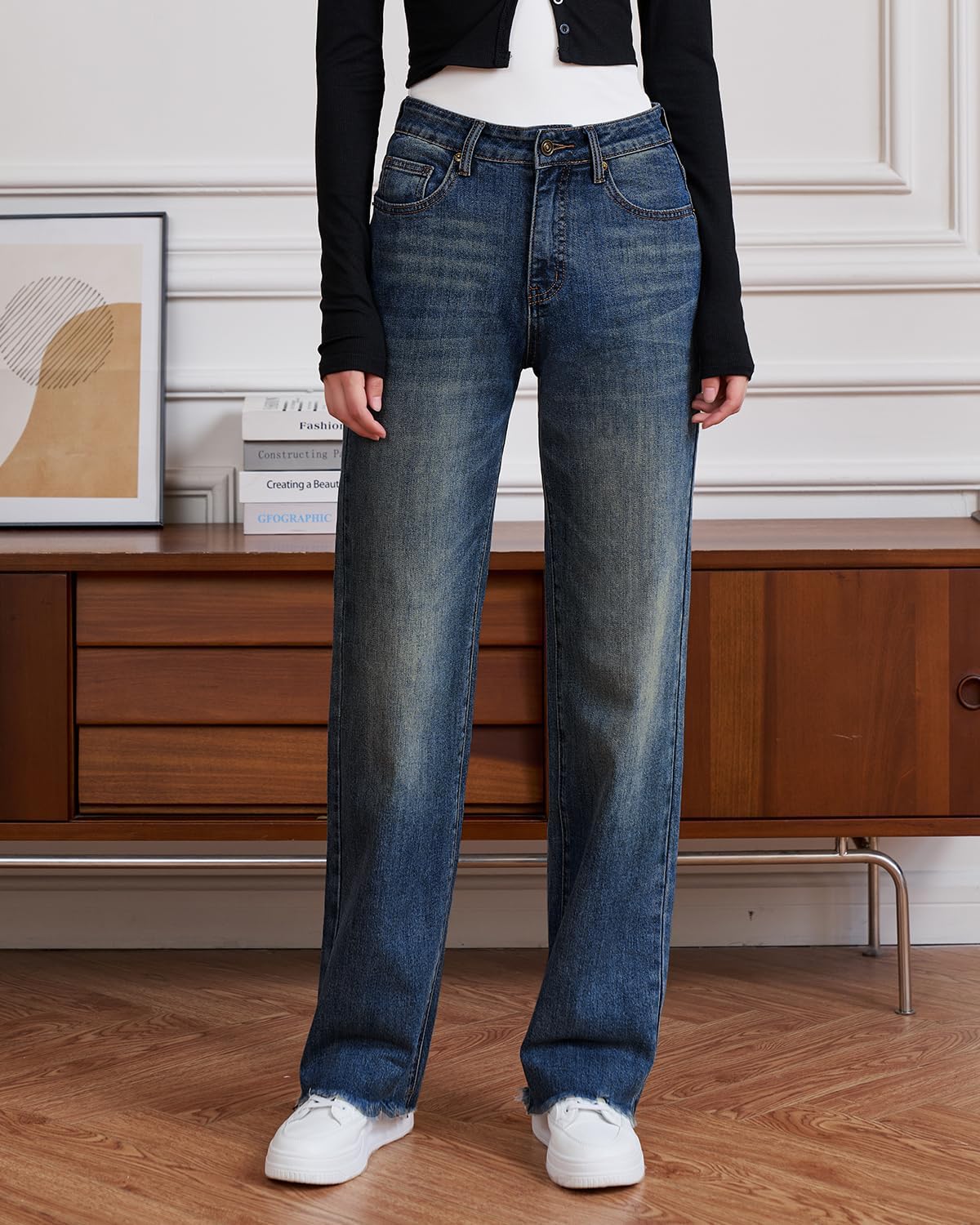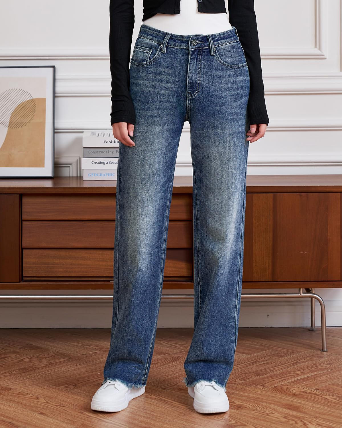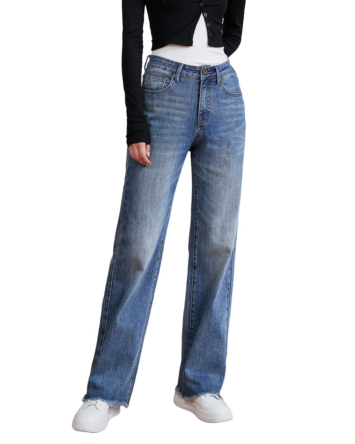 Womens High Waisted Jeans Stretchy Straight Leg Loose Fit Tummy Control Raw Hem Denim Pants Trendy 2025 Fashion