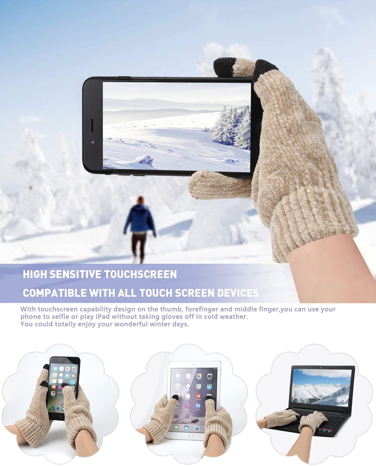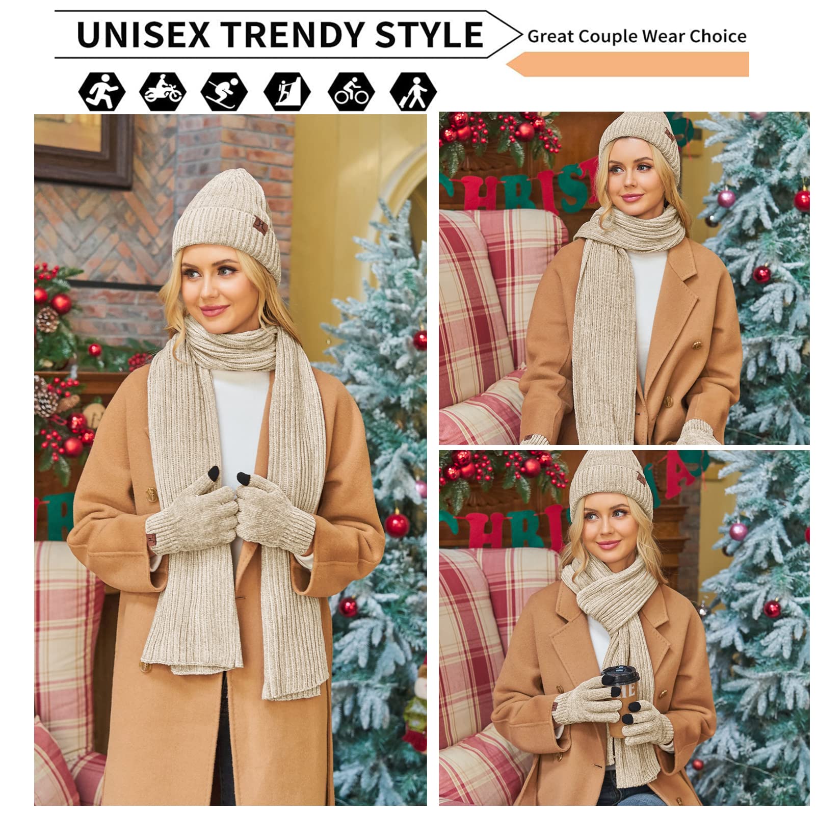 Womens Winter Knit Warm Hat Beanie Long Scarf Touch Screen Gloves Set Skull Caps Neck Scarves for Wo