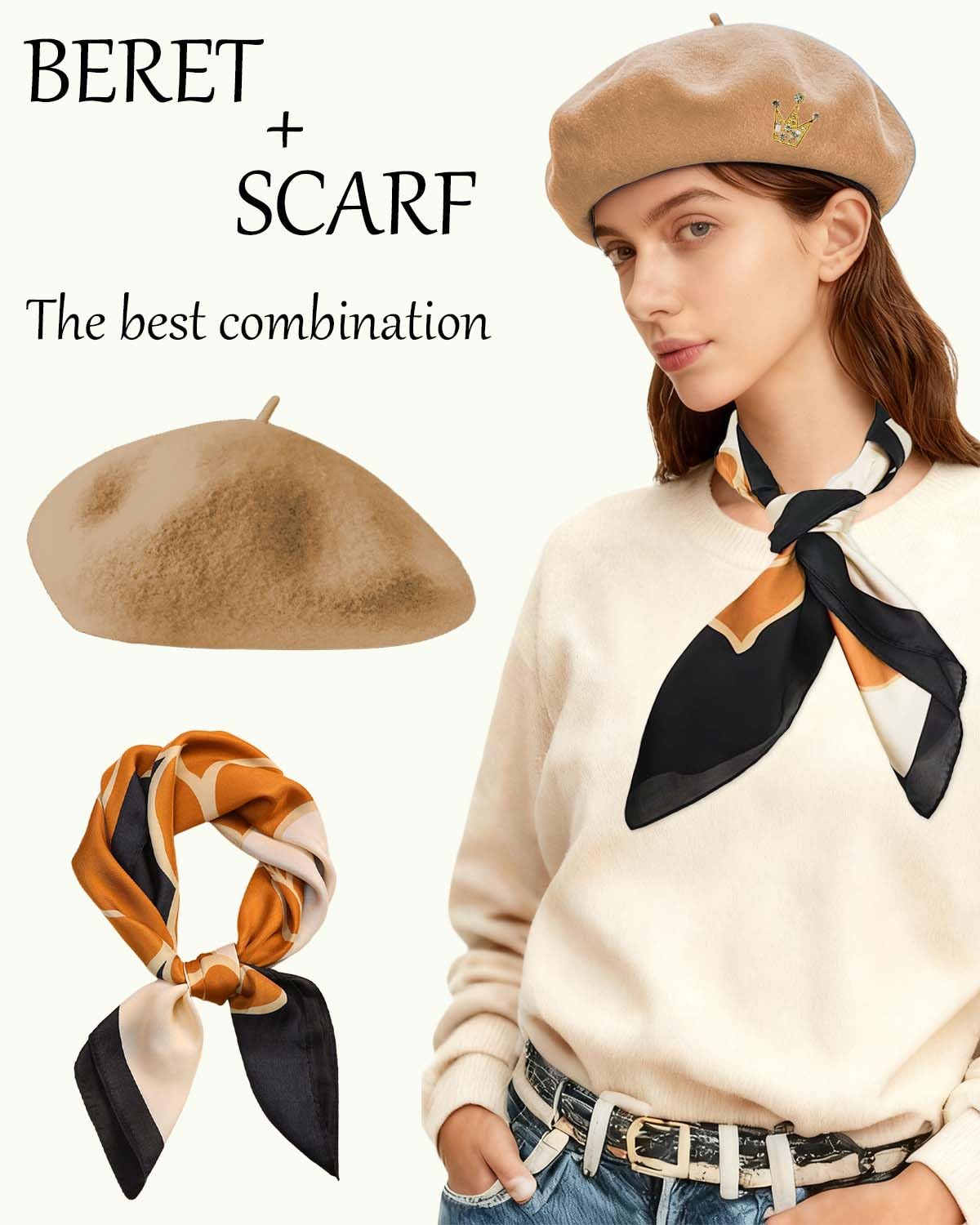 Wool Beret Hats,Solid Color French Women Winter Beanie Cap with Silky Scarf